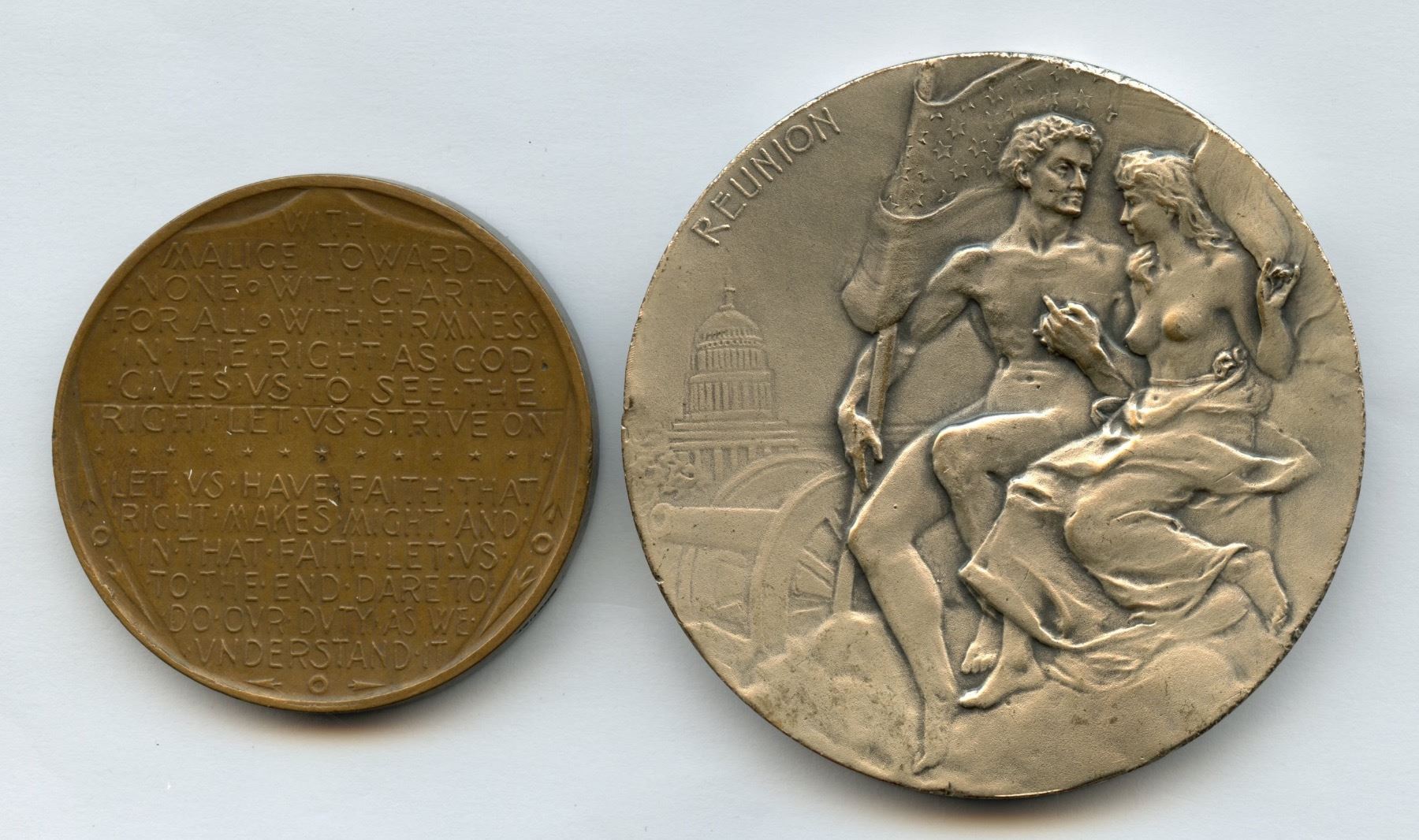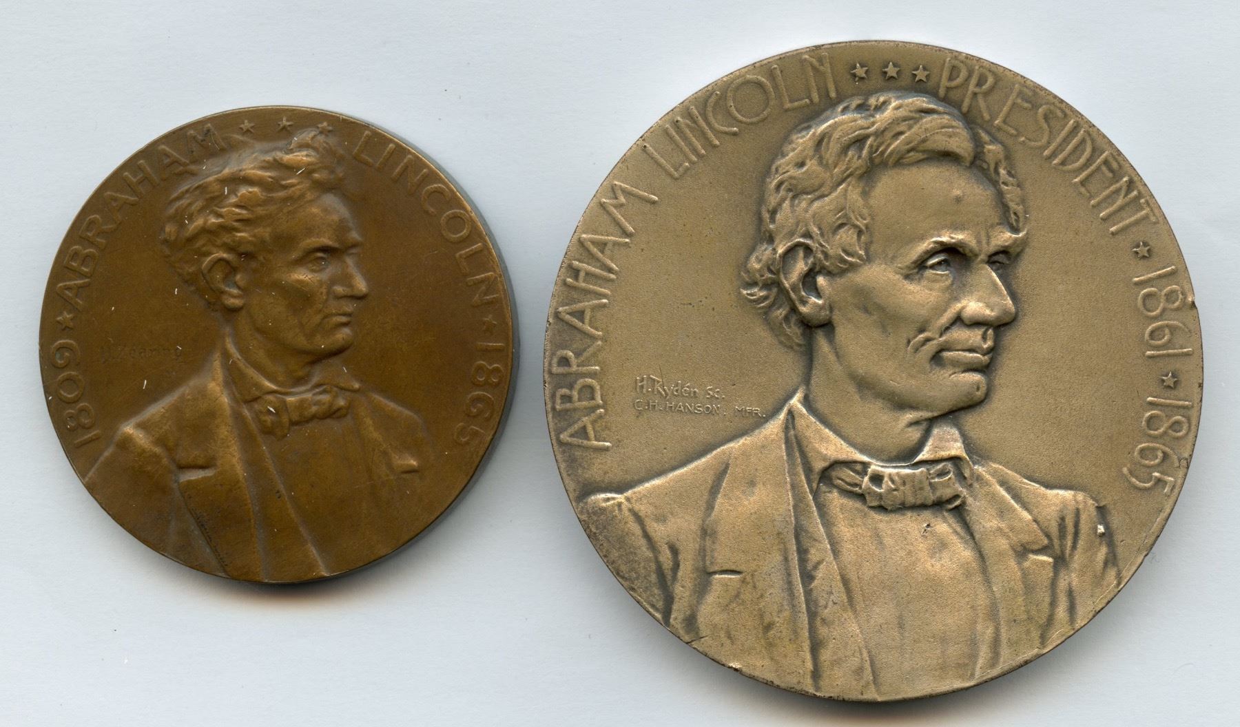 1.) Lincoln 2nd inaugural address medal in bronze. 45.5mm. 2.) (c. 1909) Lincoln medal silvered white metal. 63mm. 2 pcs.