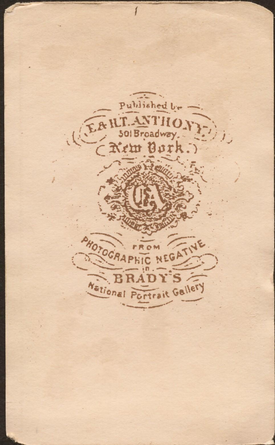 Published by E & HT Anthony from a photographic negative of Brady's national portrait gallery C1880. Brady's photo later used on US $5.00 and Lincoln cent.