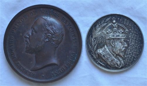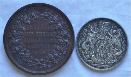 AR 39mm by J.Moore. Crowned bust r. Rev Lion & Unicorn supporting oval garter. BHM 3701 var (listed as white metal), aEF; Colonial and Indian Exhibition, London 1886. AE 52mm by L.C.Wyon. Bust of Edward left. 5 line legend in wreath. Eimer 1725, BHM 3209. 2 Pcs.