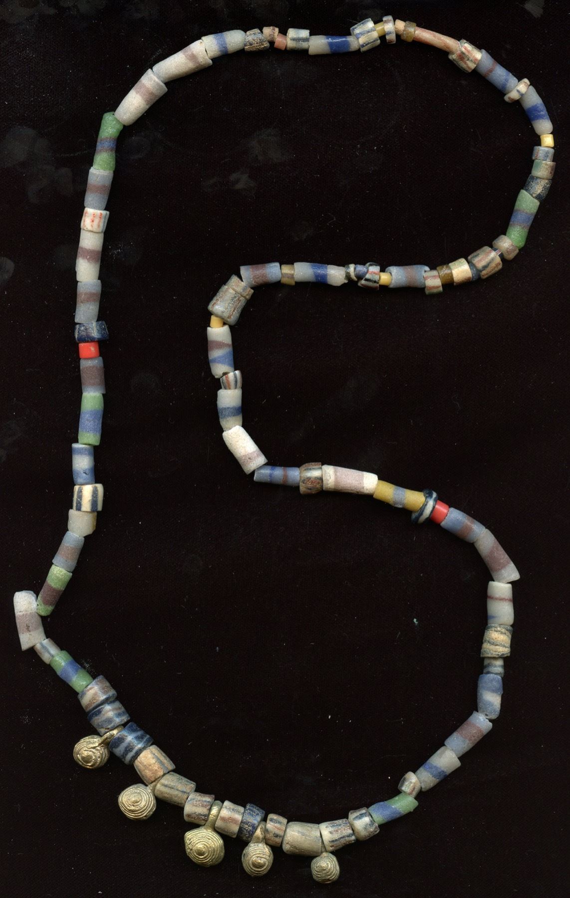 Large necklace of striped sand cast glass Trade beads. Mostly blue and green, the beads are of various sized and shapes. Also on the strand are five small hand cast bronze bells. VF.