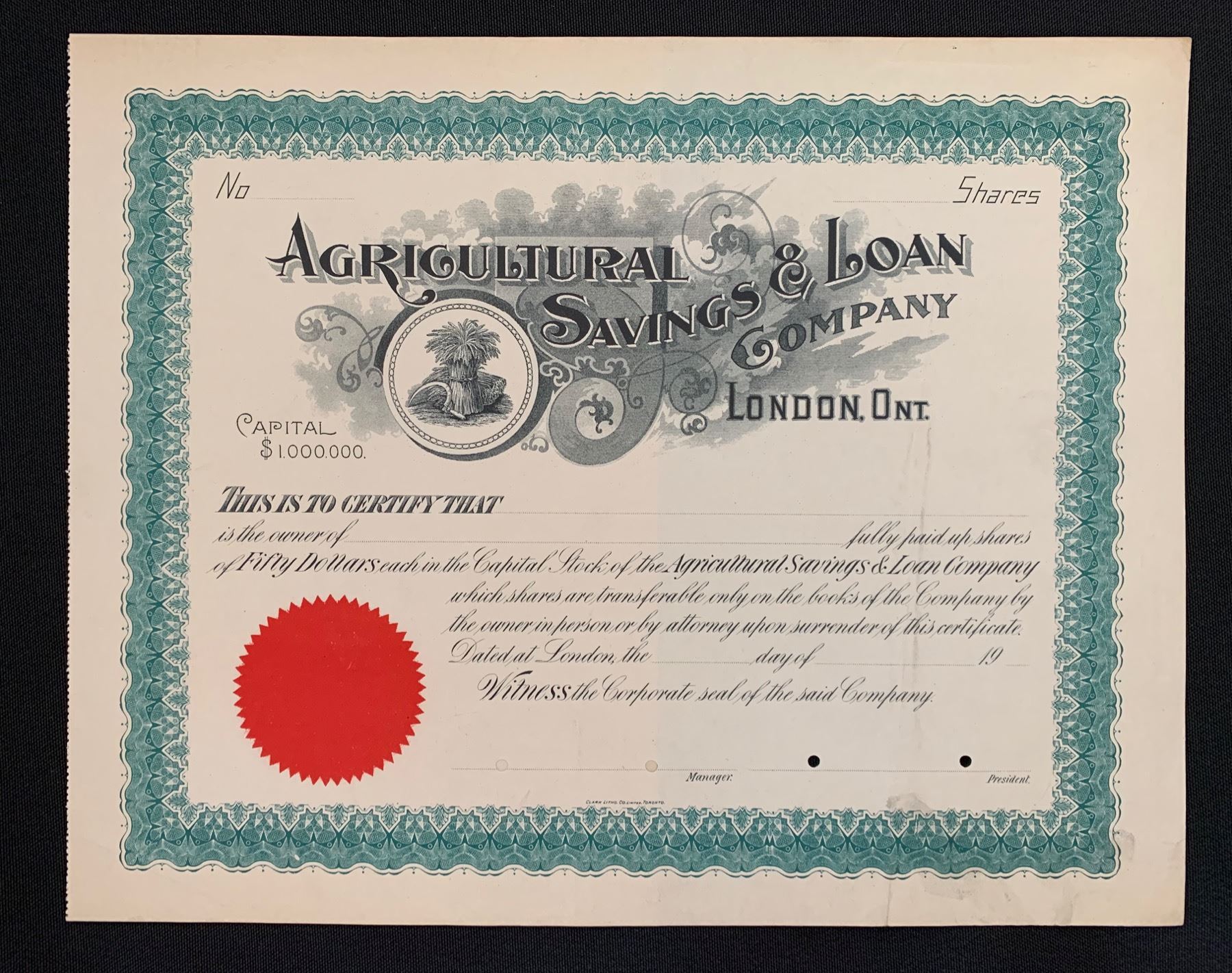 London, Stock Certificate, remainder or record copy with stub, 19__. Printed by Clark Litho., Toronto, in green and black, with red seal. Capital $1,000,000. EF condition.