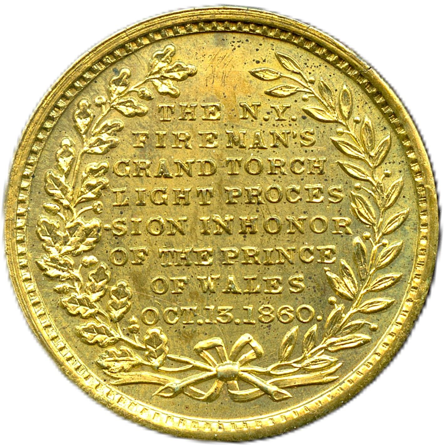 29.2mm, 12.8g, Signed S&H (Smith & Hartman). The New York Fire Department (NYFD) staged a massive procession in honor of the Prince's visit on Oct. 15, 1860, featuring nearly 5,000 uniformed firemen, torchlights, and "Drummond lights" passing the Fifth Avenue Hotel. Nice example, Scarce. UNC. 1pc. From the Geoffrey Bell Collection.