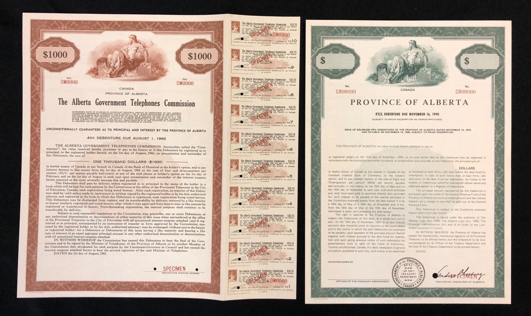 Alberta Government Telephones Commission, $1,000 debenture issue of 1970, Specimen, printed by Canadian Bank Note Co. Text is black; the border and a fine vignette are in red-brown. Ten interest coupons are attached. Also a Province of Alberta debenture, Specimen, issue of 1970, with the same vignette in green and also printed by CBN Co. Both documents are in excellent condition, with one fold at the centre.