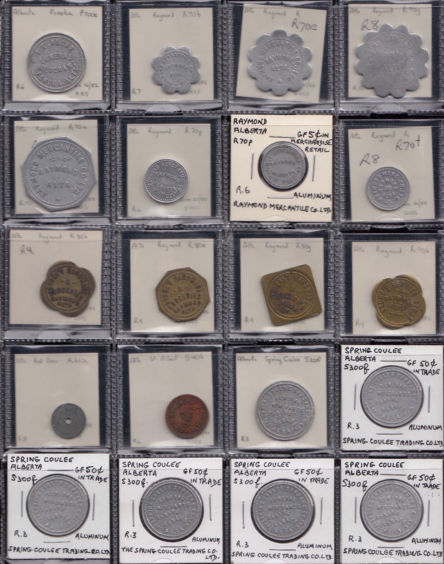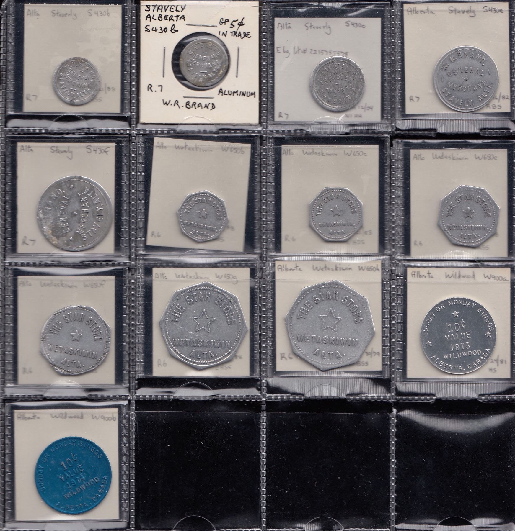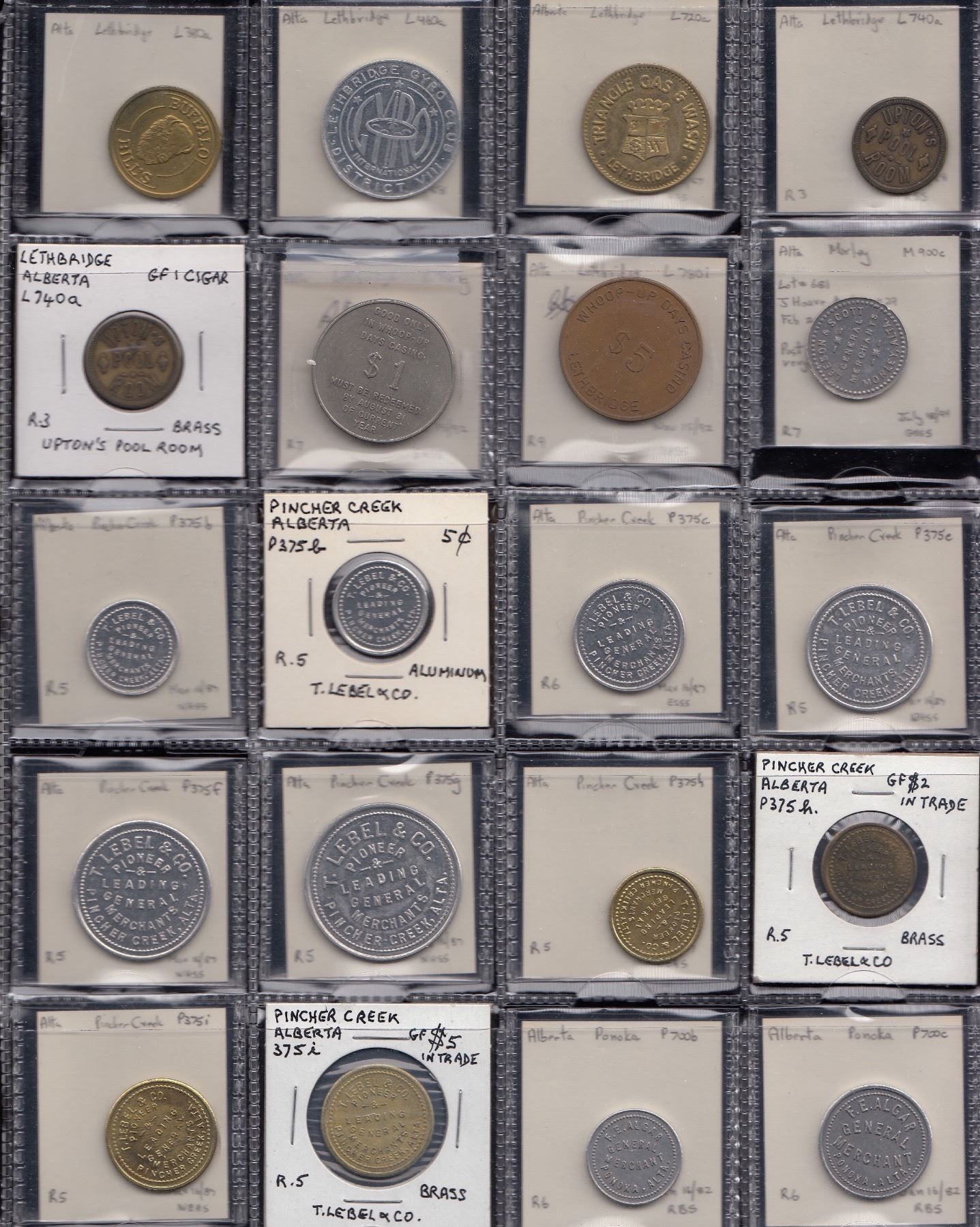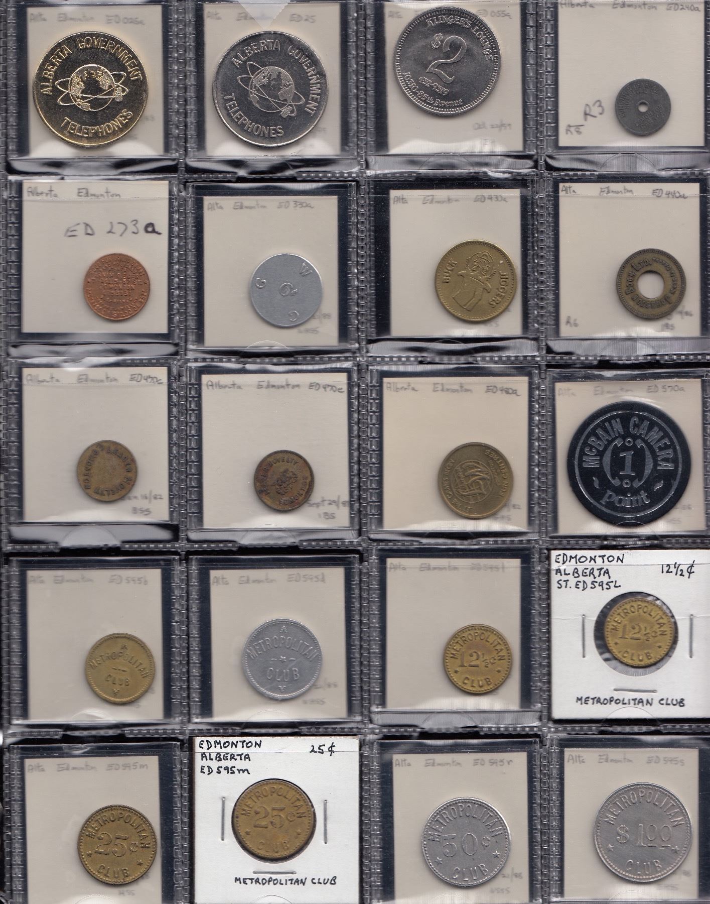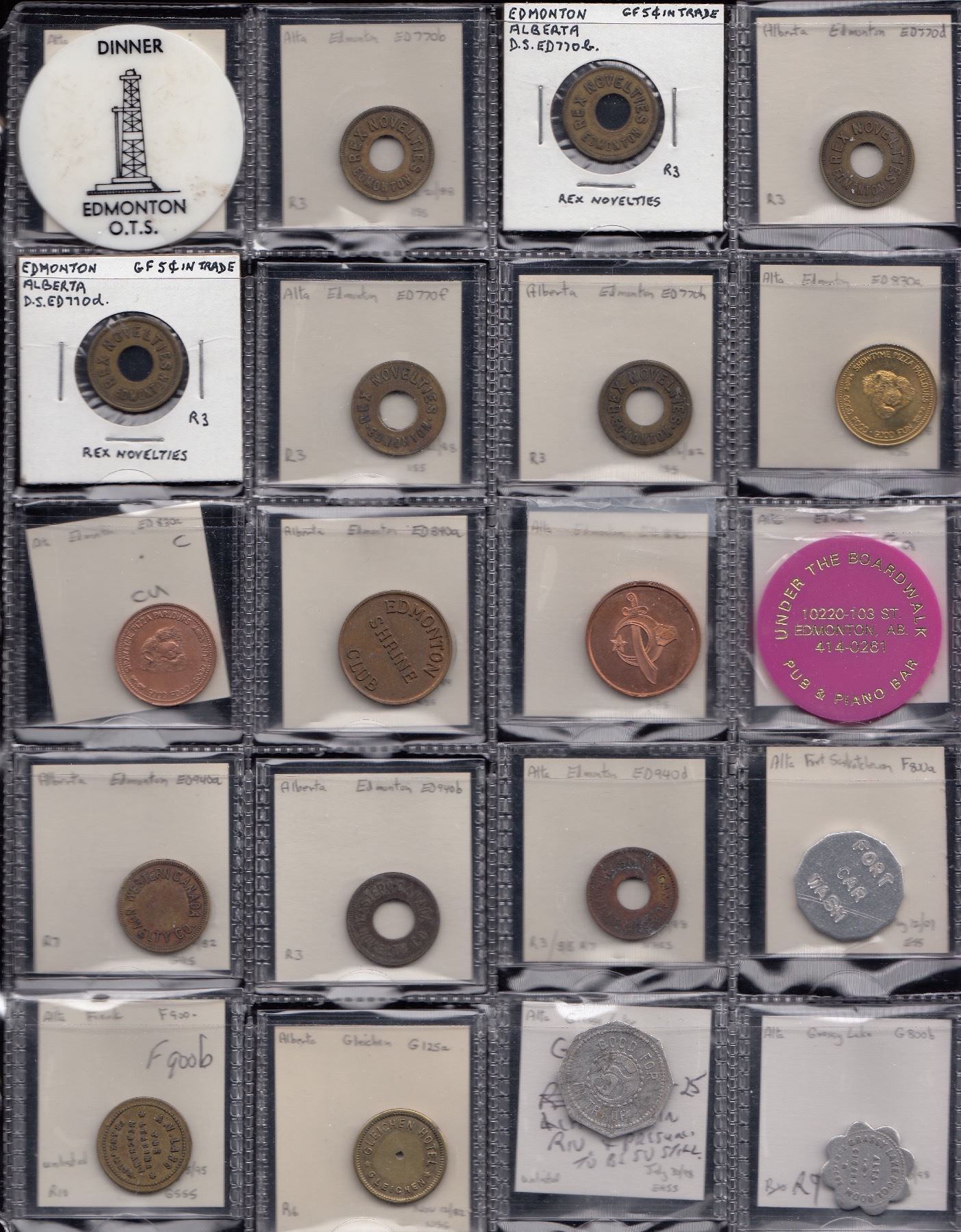 Edmonton, (note- for Edmonton listings the prefix “ED” will be eliminated) Alberta Tel. 025a, b; Armoury Dining 055a; Gen. Hosp. 240a; Arnin Eger 273a; Great Western Garment 330a; Jigger’s 430, standing clown variety u/l; Johnston Boon 440a; Leader Novelty 470c, e; Leisure World 480a; McBain Camera 570a; Metropolitan Club 595b, d, l (2), m (2), r, s, (tentative as Edmonton issues); Oilfield Tech. 670i; Rex Novelties 770b (2), d (2), f, h; Showtyme 830a, c; Shrine Club 840a (2); Under Boardwalk 918a; Western Can. Novelty 940a, b, d; Fort Saskatchewan, Fort Car Wash F800a; Frank, A.V. Lang F900b, (R9); Gleichen, Gleichen Hotel G125a; Grassy Lake, Club Billiard Room, G795b, 5c, A-O-15, R10. It is still presumed the rarity rating still applies.; Grassy Lake Pool Room G800b (R9); Hanna, Municipal Hospital H100a (R8); High River, A.R. Laidlaw’s H575b, c (2), e (2) & f; Irvine, Carl Beny I-600l, m, n; Fred. Weiss I-700b dented, f scratches, both (R8); Killam, F.E. Nichol K50b, e, g (R8); Lac La Biche Squirrely’s L50a; Lethbridge, Alberta Gum L260b (2), c, e; Buffalo Bill’s L380a; Gyro Club L460a; Triangle Gas L720a; Upton’s Pool L740a (2); Whoop-Up L780g, i; Morley, Leeson & Scott M900c; Pincher Creek, T. Lebel P375b (2), c, e, f, g, h (2), i (2); Ponoka, F.E. Algar P700b, c, e; Raymond, Raymond Mercantile R70b, worn, e (R8), g (R8) worn, n (R8), p (2), t (R8); Stone’s Hdwe. R80b, e, g; Stone’s Service R90b; Red Deer, Hospital R610a (R8); St. Albert, Ryan Bros. S40B; Spring Coulee, Spring Coulee Trading S300f (6); Stavely, W.R. Brand S430b (2), c, e, f; Wetaskiwin, Star Store W650b, c, e, f, g, h; Wildwood, BPOE W900a, b. VG - Unc, generally fine - VF. 113 Pcs.