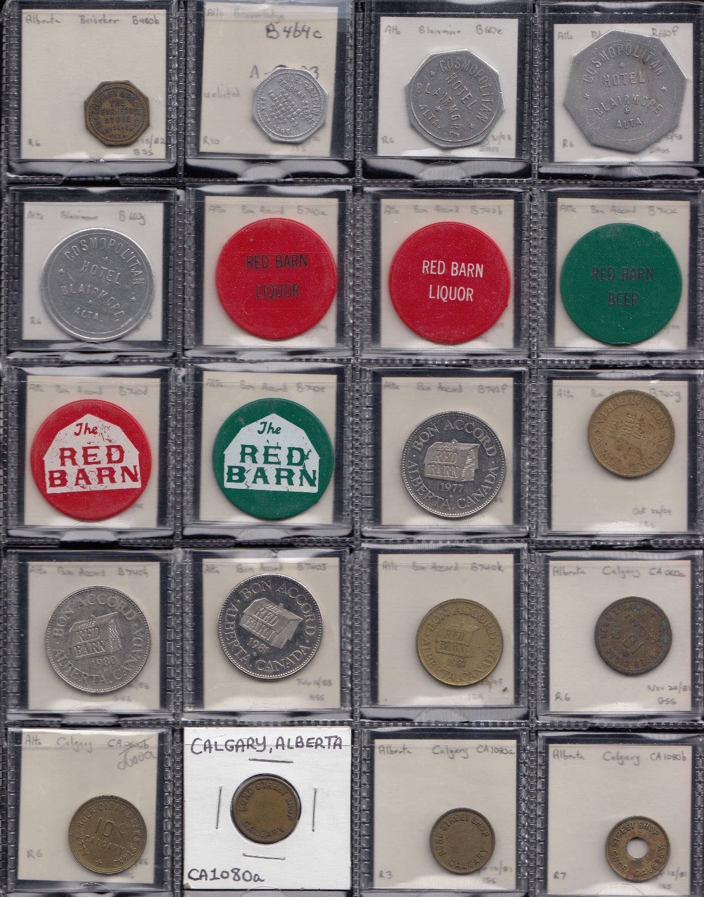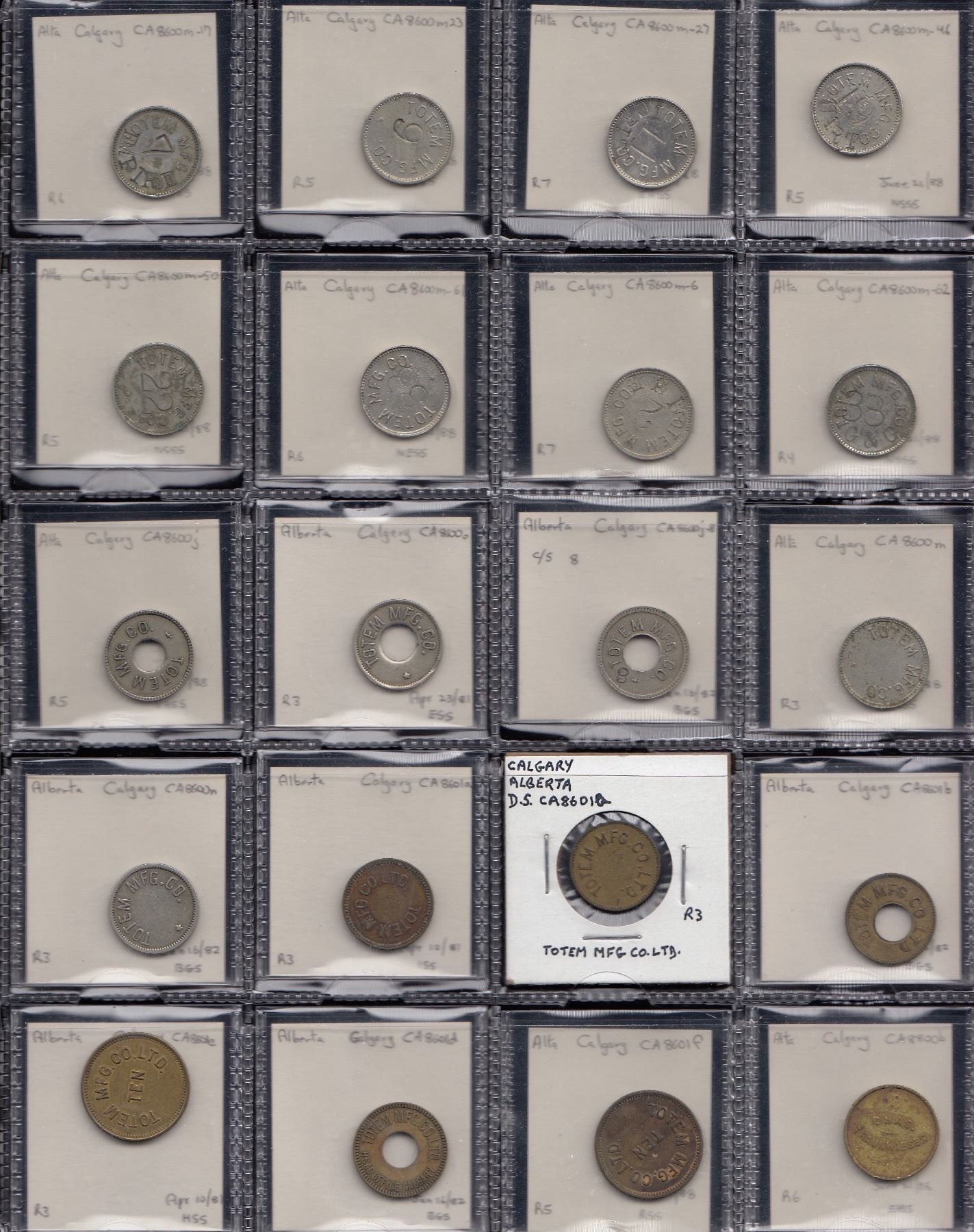 Beiseker, Beiseker Merc’le Co. B480b; Beaverlodge, I.E. Gaudin, g/f 10c, A-O-23, fine/vf, R10. UNLISTED, will be recorded by Mr. Jensen as B464c; Blairmore, Cosmopolitan Hotel B660e, f bent, & g; Bon Accord, Red Barn B740a, b, c, d, e, f, g, h, j, & k; Calgary, (note- for Calgary listings the prefix “CA” will be eliminated) Alexander Cigar 600a (2); Bond Street 1080a (2), b; Calgary Arcade 1260a; Calgary Automatic 1320a; Brewing 1440b, c, d, e; Calgary Herald 1680a; Calgary Health Sciences 1860a, b; Calgary Novelty 1980a; Consolidated Novelty 2600a; Crist 2820d, f, g; Cupid Novelty 3100b, c, d; Devonian 3300a; Dominion Novelty 3360b, d, e, f; Sol Dworkin 3420c; Empire 3480a; Expert Rug 3540a; Havana Cigar 4080a; Home Plate Cigar 4260d (R8); Illusions 4440a; Inter City 4620a, b; Jr. Chamber 4680a; Joy Parlor 4740a, b, c; Key’s 4800a, c (2), d; Maerov Bros. 5400d (R8); Mountain Wash 5990c; N. W. Novelty 6200, 11 different varieties; Owl Cigar 6280c; Pryce Jones 6800a, b; Queen’s Cabaret 6860a (2); Stargate 8120a; Totem Mfg. Co. 8600, 16 varieties, 8601, 6 varieties; Chas. Traunwieser 8800b; White Lunch 9500b; Yale Hotel 9940a (2), b; Camrose; D. Sampson C180b (R8), c (R8), e (R7), f (R8), g (R8); Cardston, H.S. Allen & Co. C355d (R9); Coleman, Veterans’ C890b, e; Drumheller, Amusement D765a, b; Novelty Works D840b 24mm, another 21mm. u/l, appears shaved. VG - Unc, generally Fine - VF. 116 Pcs.