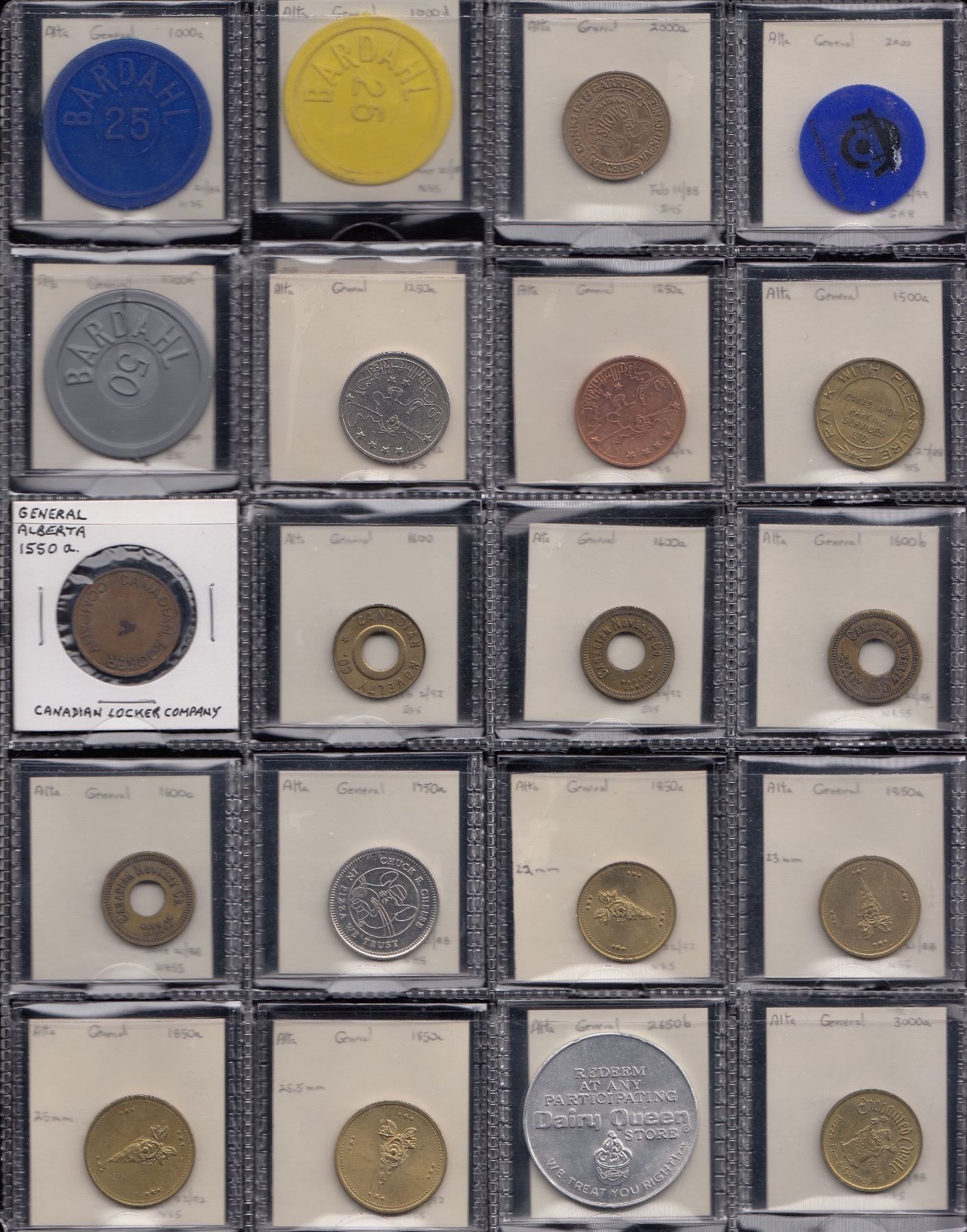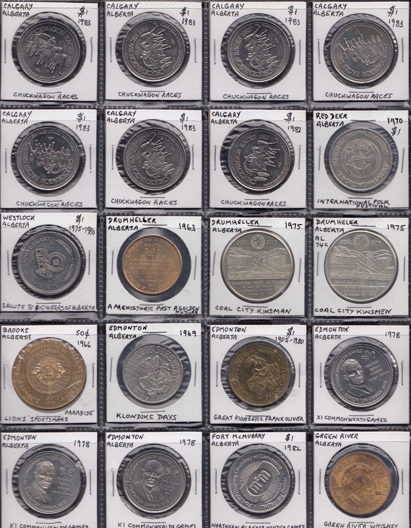 Alberta General Tokens; These tokens were used in the Province at multi locations and are not attributed to any specific town/city. Both Stewart and Jensen list these under the “General” category. There are 46 general tokens in this lot, as well as 4 misattributed pieces. Transportation & related: Calgary, Heritage Park CA4140a, b (ar); CA4140c, d (ar); CA4140e (2), Atwood 140A; CA4140g, Atwood 140B; CA4140i, Atwood 140C; CA4140k, Atwood 140D; Lethbridge, Handi-Bus L515c, Atwood 450B, L515b, Atwood 450D. Parking tokens; Calgary CA2040a (3); Edmonton, ED170d; Lethbridge, Lacidem L505, (4 all diff.); Red Deer, R270a (4), 2 counter stamped “Sisson Furs; 2 others attributed to Alberta, not catalogued. Labatt’s Brier 1997, Calgary set of 14 different medals incl. Brier Bear, and Provinces and Territories. Trade Dollars, various Alberta locations, 52 Pcs. Commemorative, various events etc. 33 Pcs. Advertising, Bruce, “The Ideal Place to Locate”, one br. other wm; Ellis & Grogan, Fire Baskets and Grates, Calgary, br. Should be viewed. Fine - Unc. 177 Pcs.