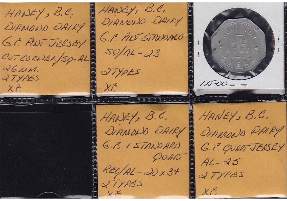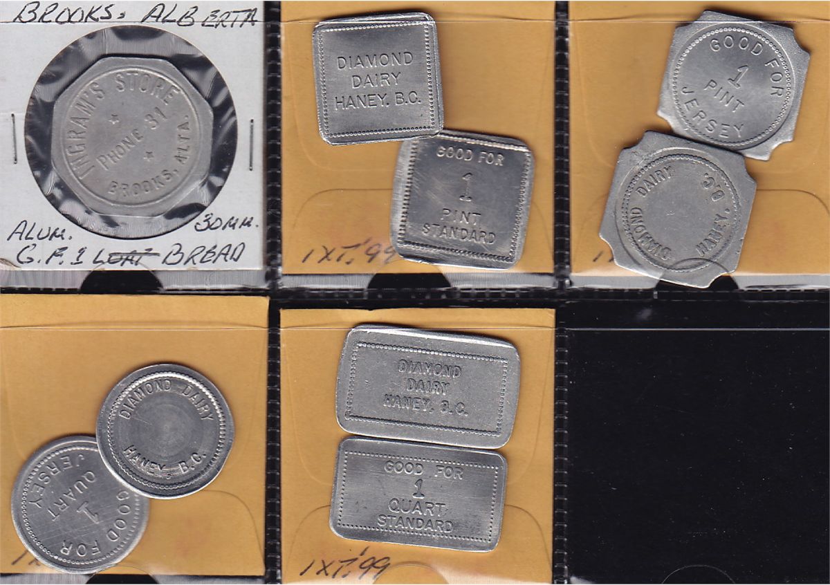Alberta and British Columbia Trade Tokens, Lot of 9. Includes: Ingram's Store, Brooks, AL, 1 loaf, VF, aluminum, Diamond Dairy, Haney, BC, pint standard, x2, UNC, aluminum, Diamond Dairy, Haney, BC, 1 pint jersey, x2, EF, aluminum, Diamond Dairy, Haney, BC, 1 standard quart, x2, EF, aluminum, Diamond Dairy, Haney, BC, 1 quart jersey, x2, EF, aluminum. 9 Pcs.