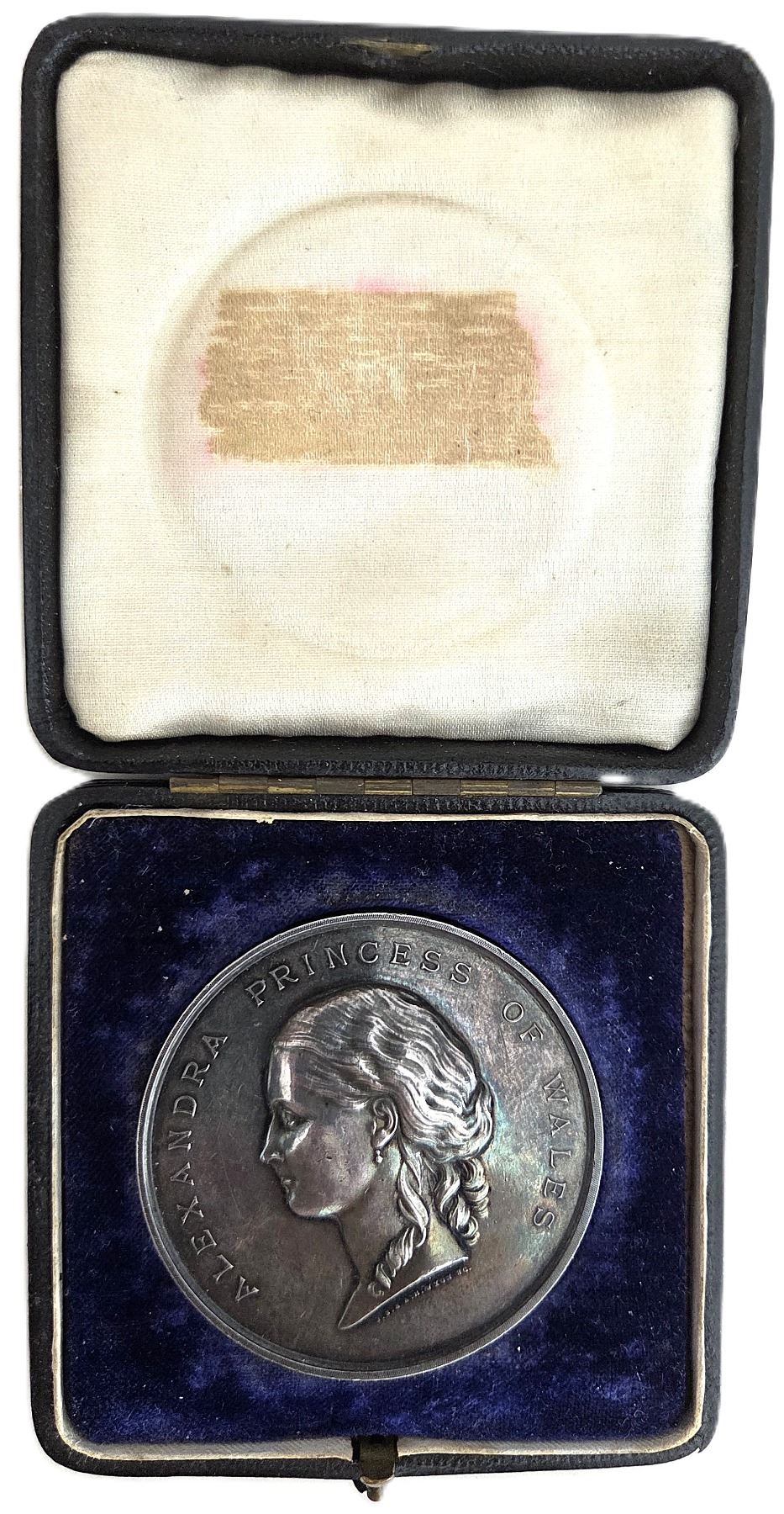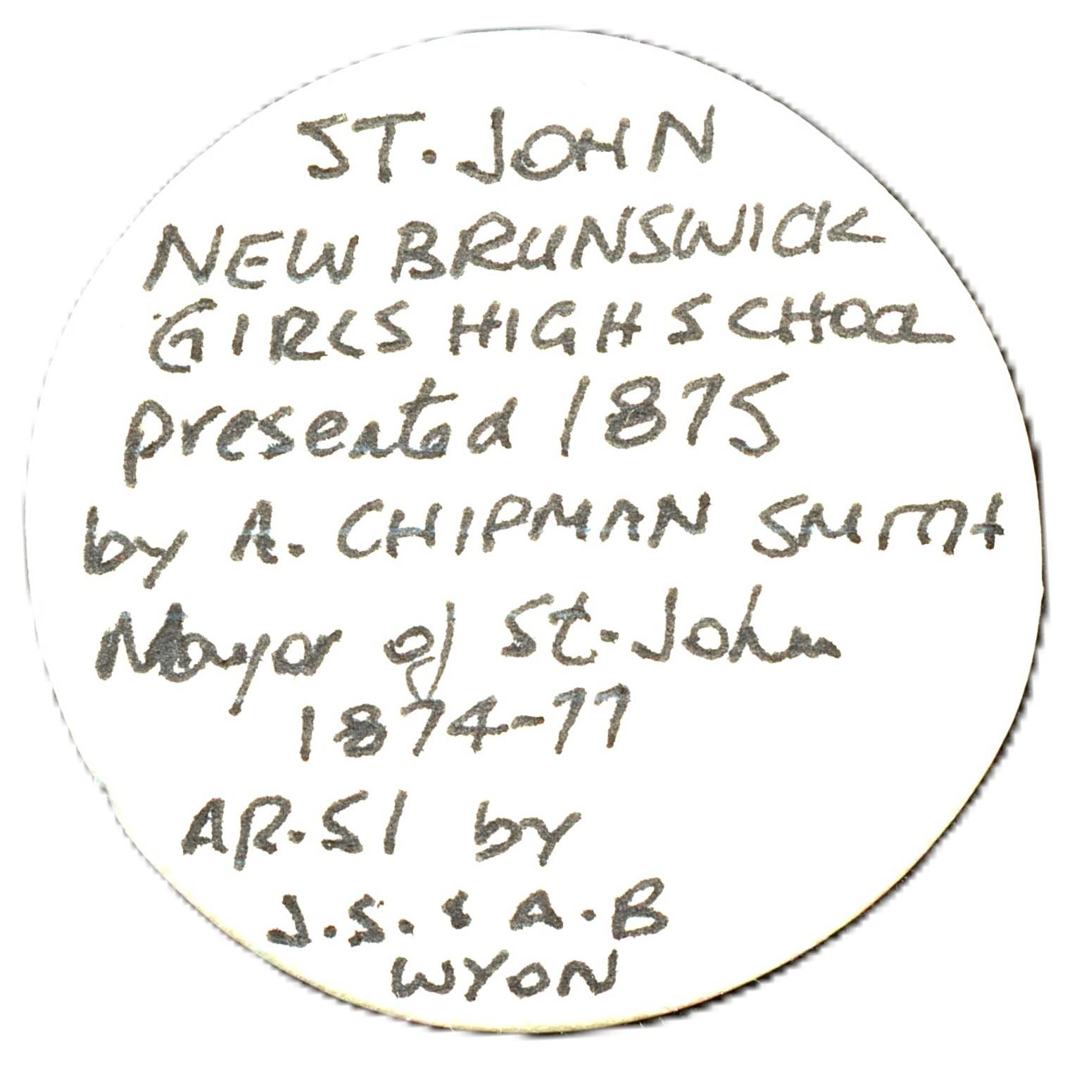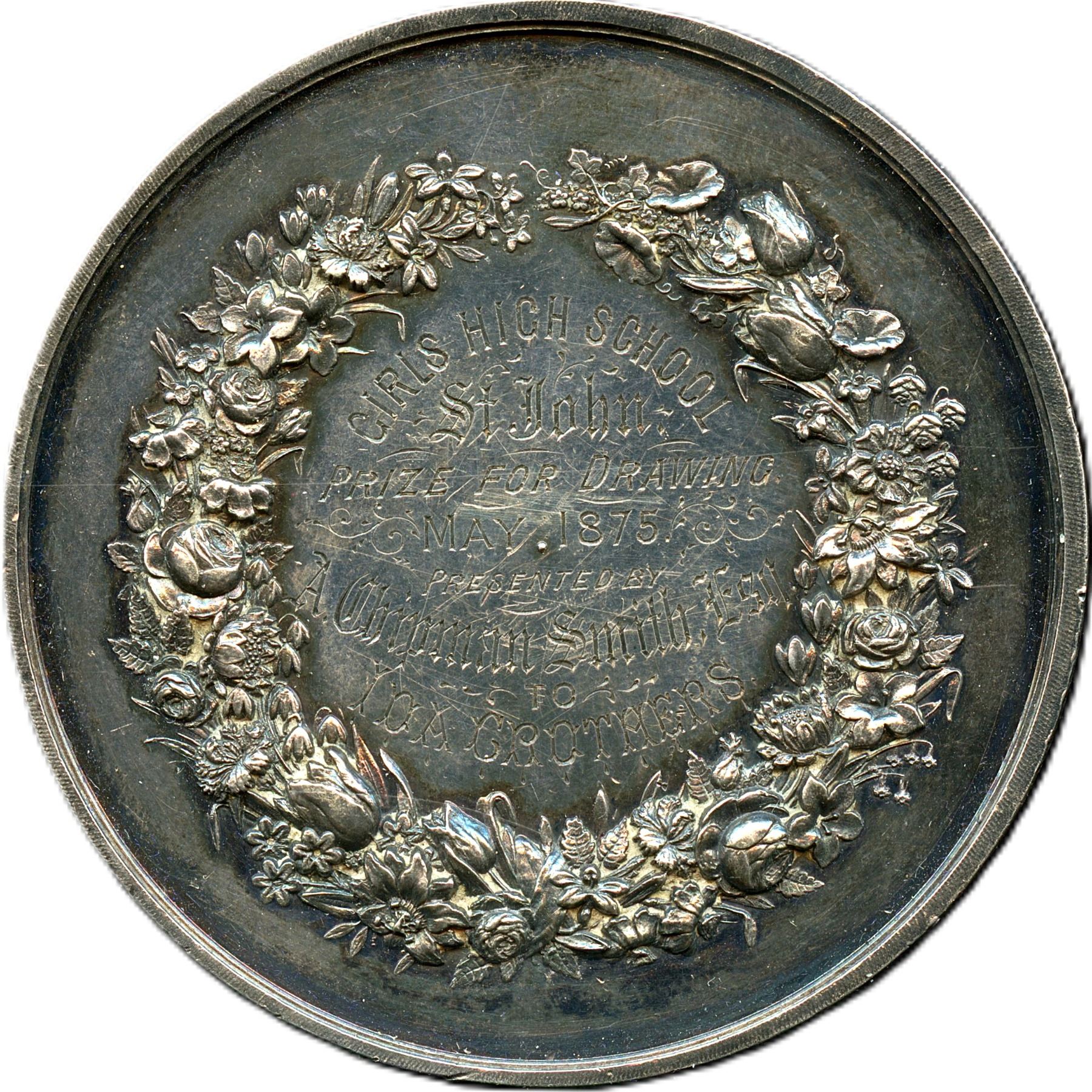 Rev: Girls High School St. John Prize For Drawing May 1875 Presented By A. Chipman Smith Esq. (Mayor of Saint John 1874-1877) To Ida Crothers (1858-1931), Signed J.S. & A.B. Wyon, 51mm, 59.1g, Housed in a black leather box with purple velvet interior. Original surfaces with violet patina over reflective fields with tick marks and minor rubbing on high points, EF. Scarce. 1pc. From the Geoffrey Bell Collection.