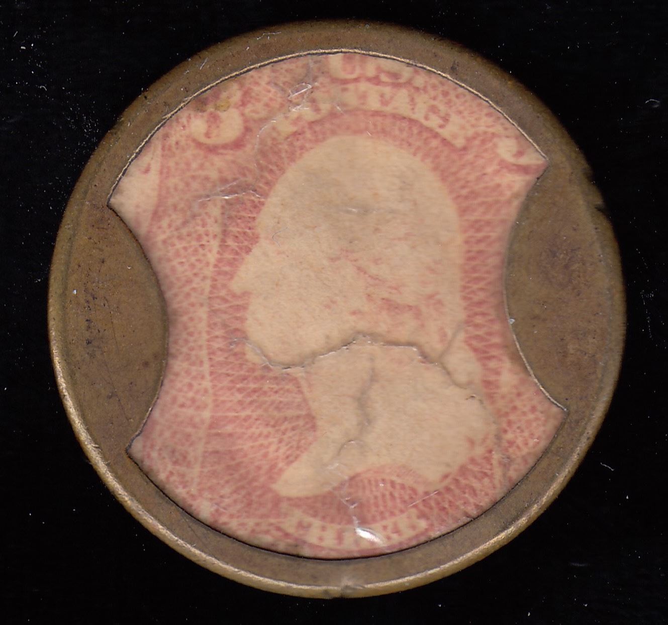 Civil-war era encased postage stamp. Reverse about VF, with one rim bruise. Mica with cracks, but all present.