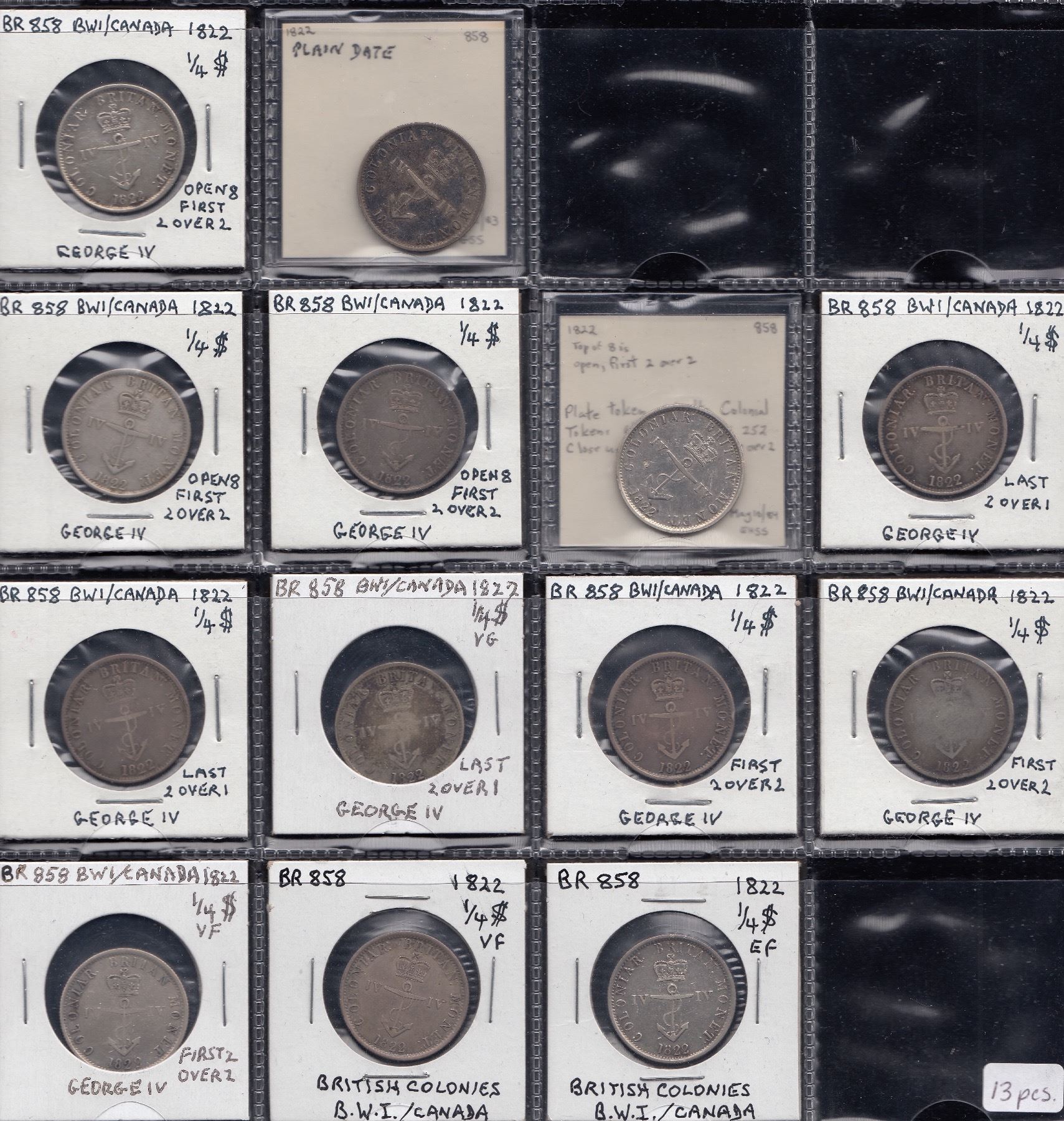 Br. 858, Anchor Money, ¼ dollar, silver, 1822 plain dates, 1822 overdates 2 over 1, 2 over 2. 13 Pcs. F – VF, with majority VF.