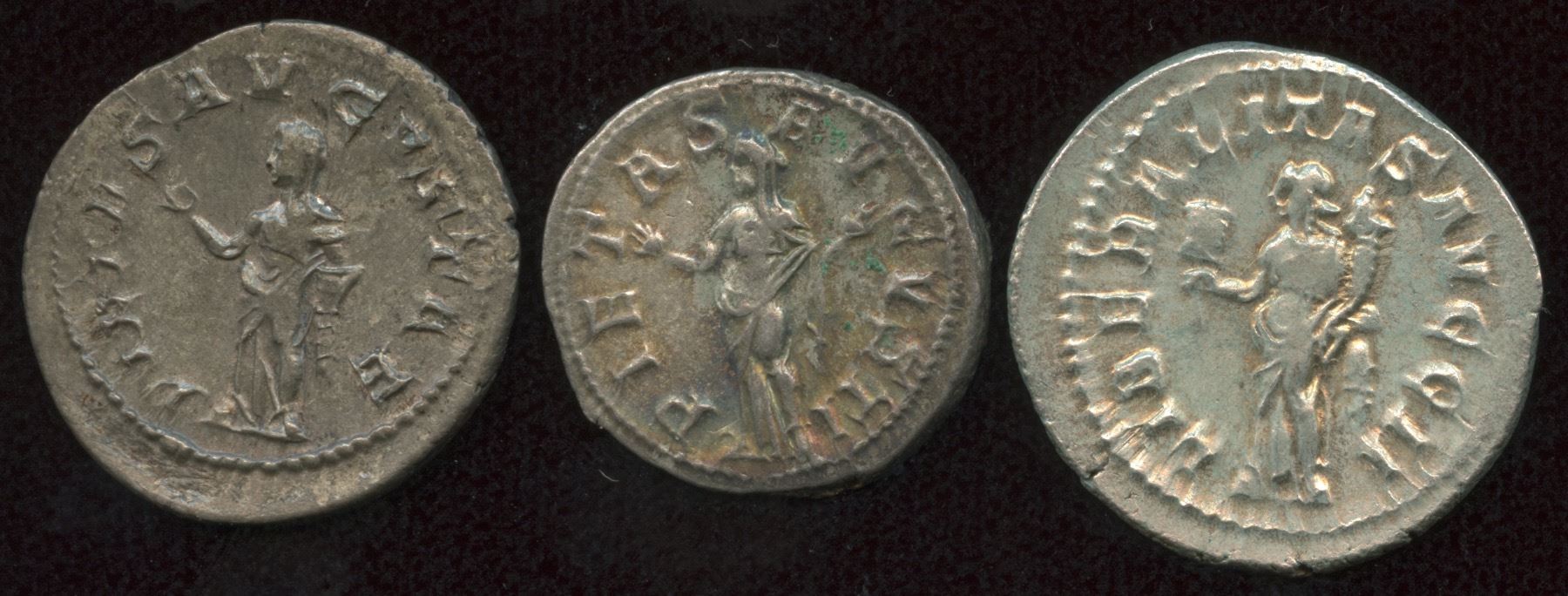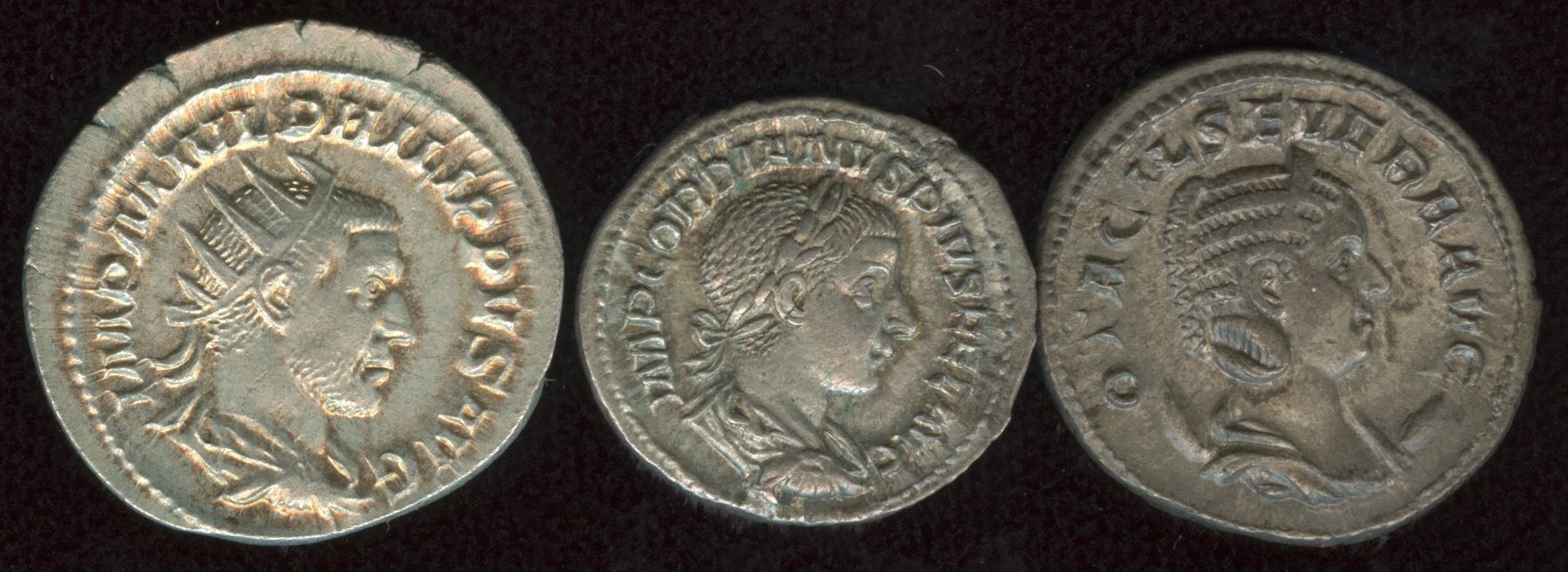 Gordian III AD 238-244 Denarius, rev. Pietas standing left, 3.50g good Very Fine; Philip I (AD 244-249) Antoninianus , revs. Liberalitas standing left, 3.97g, Extremely Fine; Otacilia Severa (spouse of Philip I) Antoninianus revs. Pietas standing left, 3.95g good Very Fine, 3 Pcs.