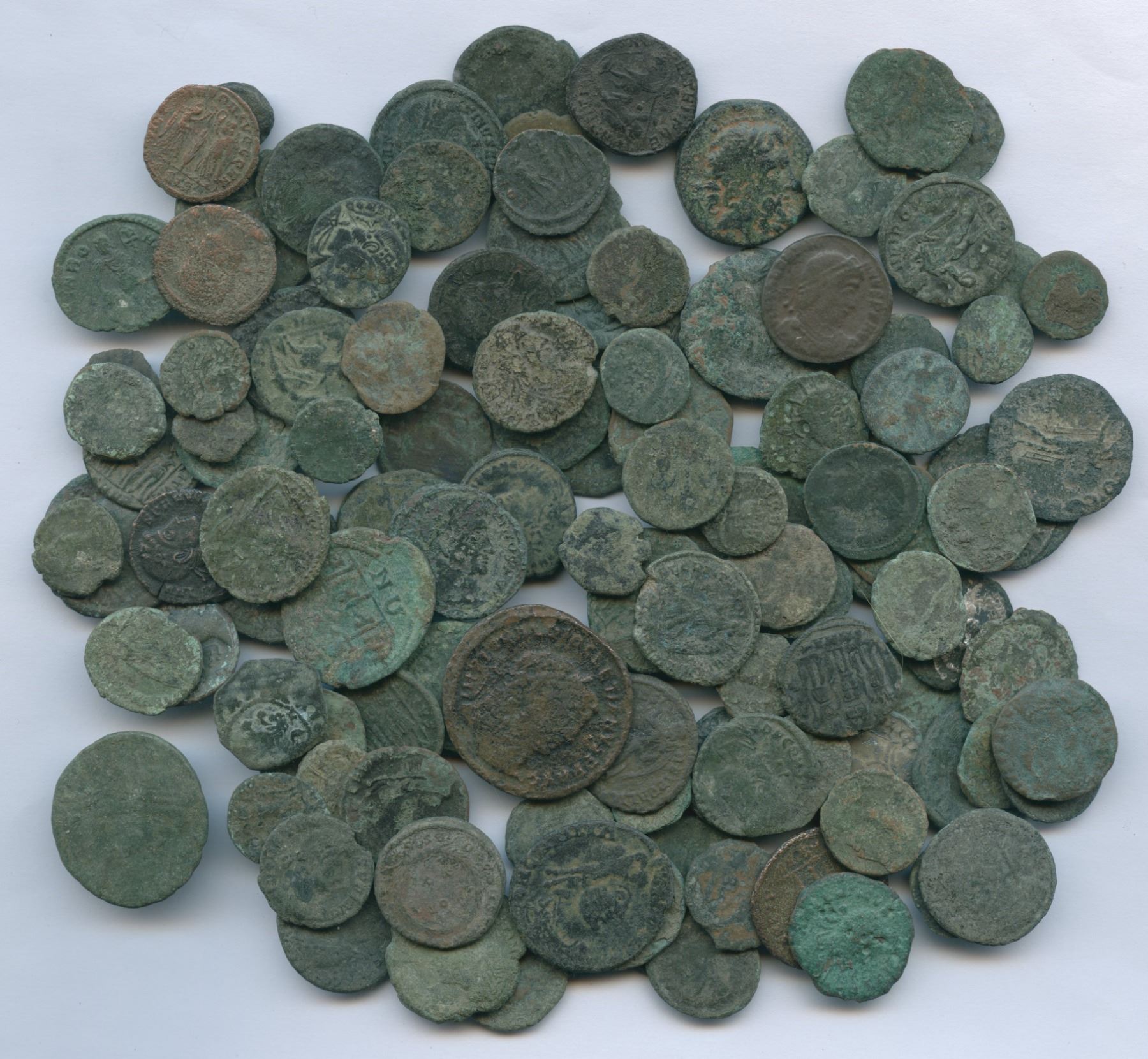A large lot of partially-cleaned and uncleaned coins that could yield some interesting finds. There are 91 coins that can be identified as Roman Imperial. An additional 30 mystery coins where cleaning is needed. 121 Pcs.