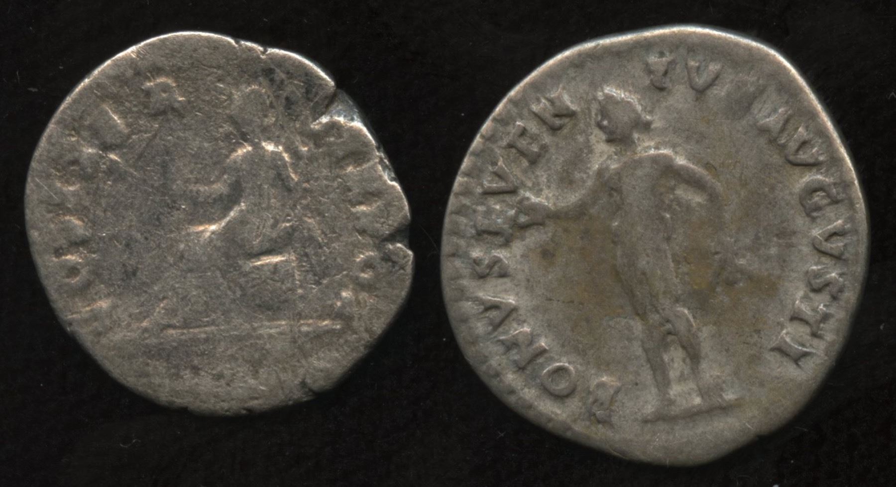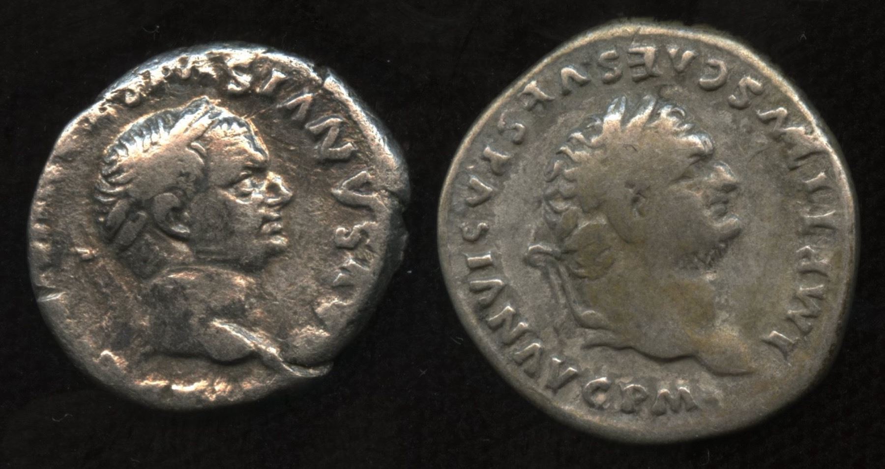Vespasian(3.05g) Rev: Pax seated l. holding olive branch and caduceus. RIC 10; gF/F || Titus, as Augustus (3.30g) Rev: Bonus Eventus standing l., holding patera and corn-ears. RIC 89; gF. 2 Pcs.