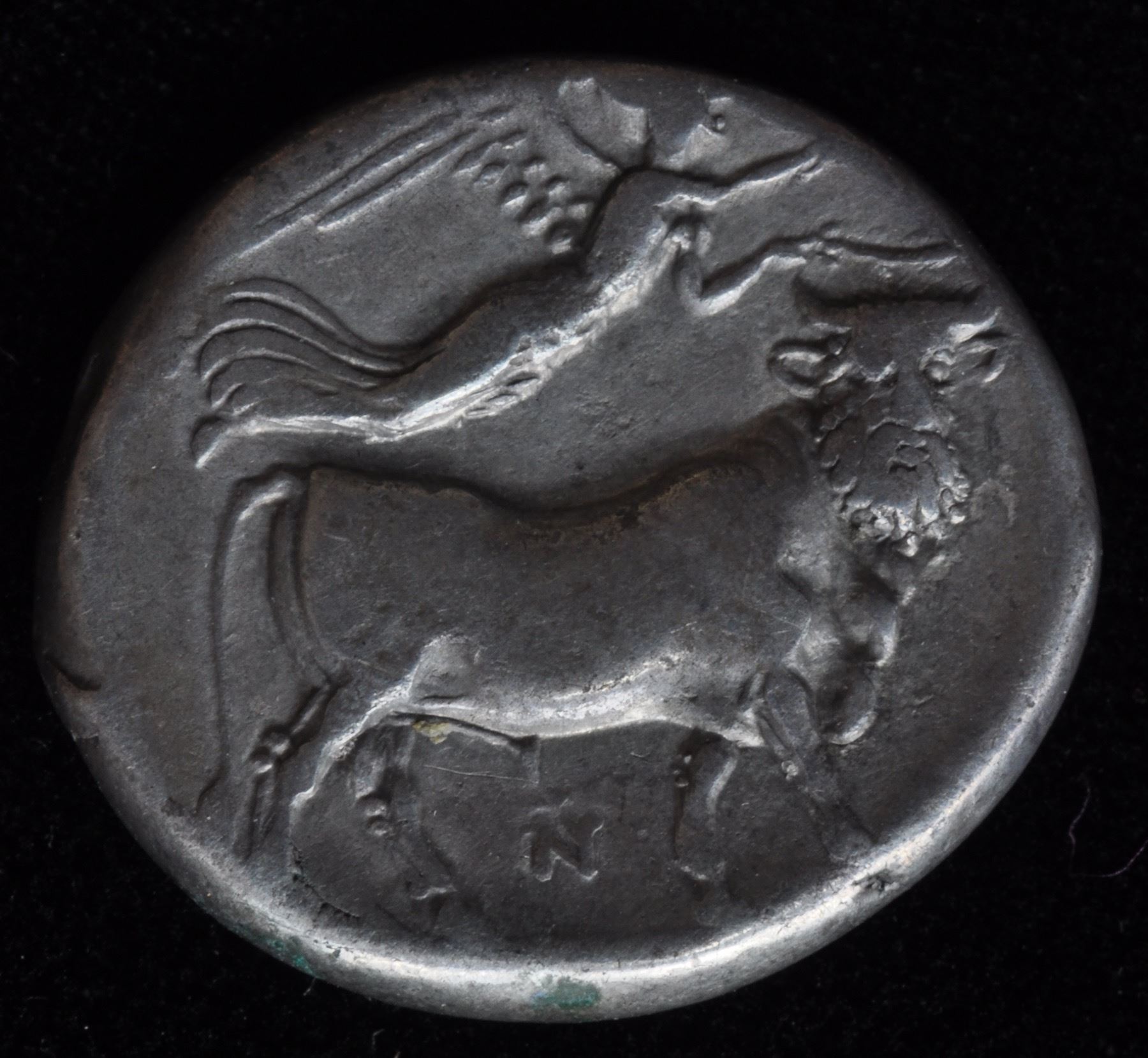 AR DIDRACHM 7.20gr. Head of Nymph r. Rev. Man-headed bull walking r. Nike flying above. SNG ANS 373 var S.299 var. VF.
