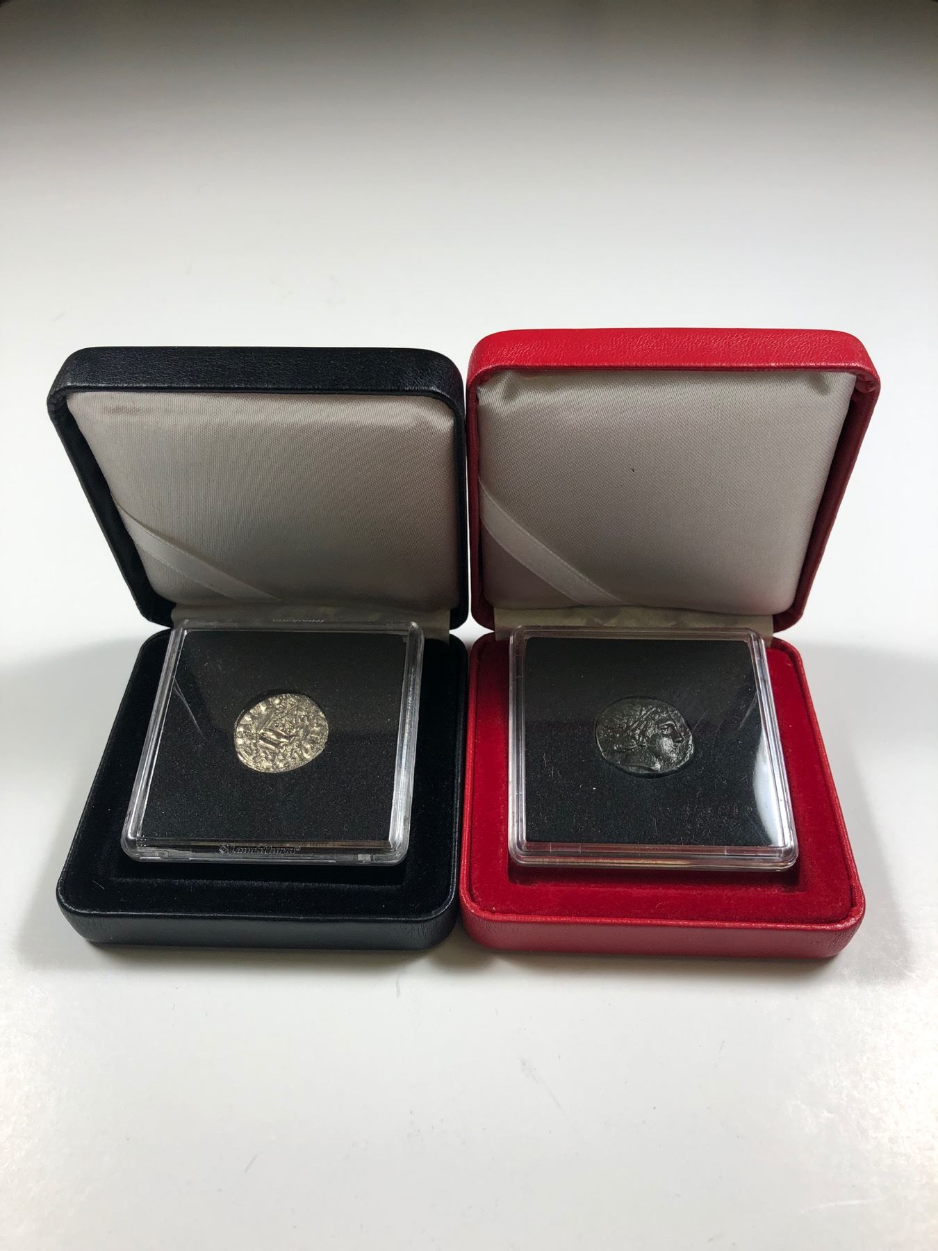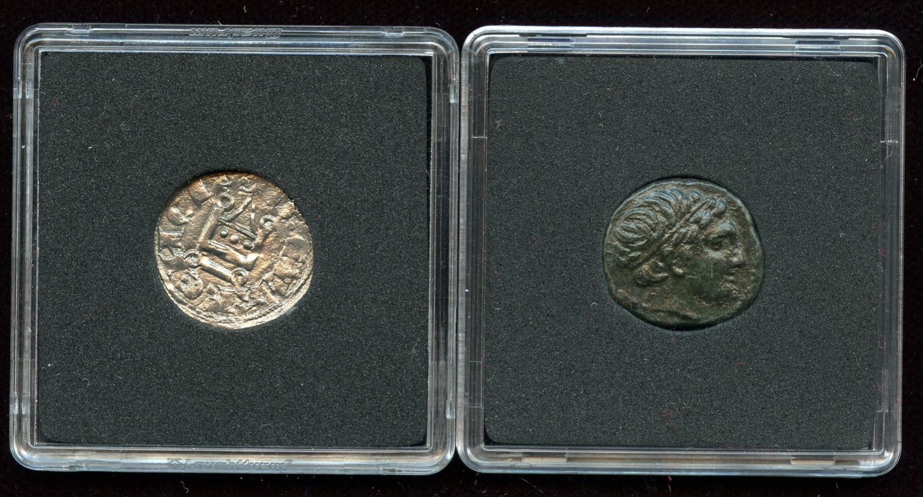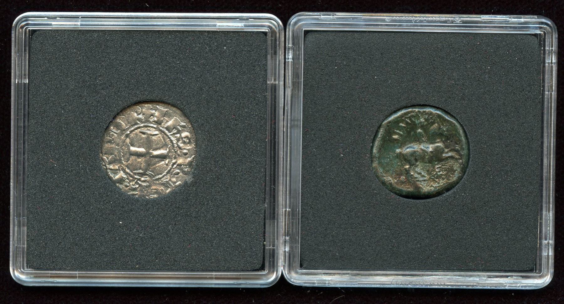 Frankish Greece Silver Denier 1287-1308 CE In black case with COA PLUS Ancient Green Bronze Coin Philip II 359-336 BCE - in red case with COA. 2 Pcs.