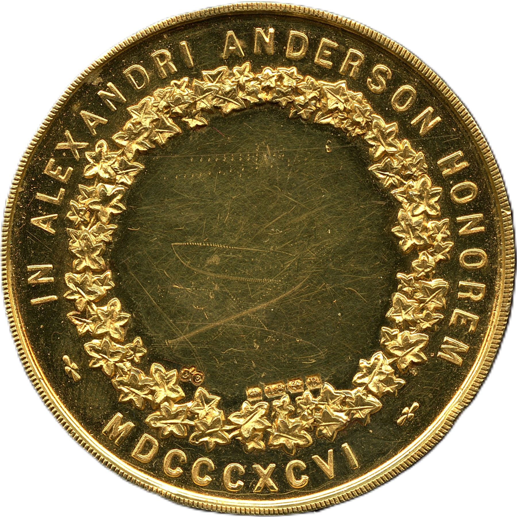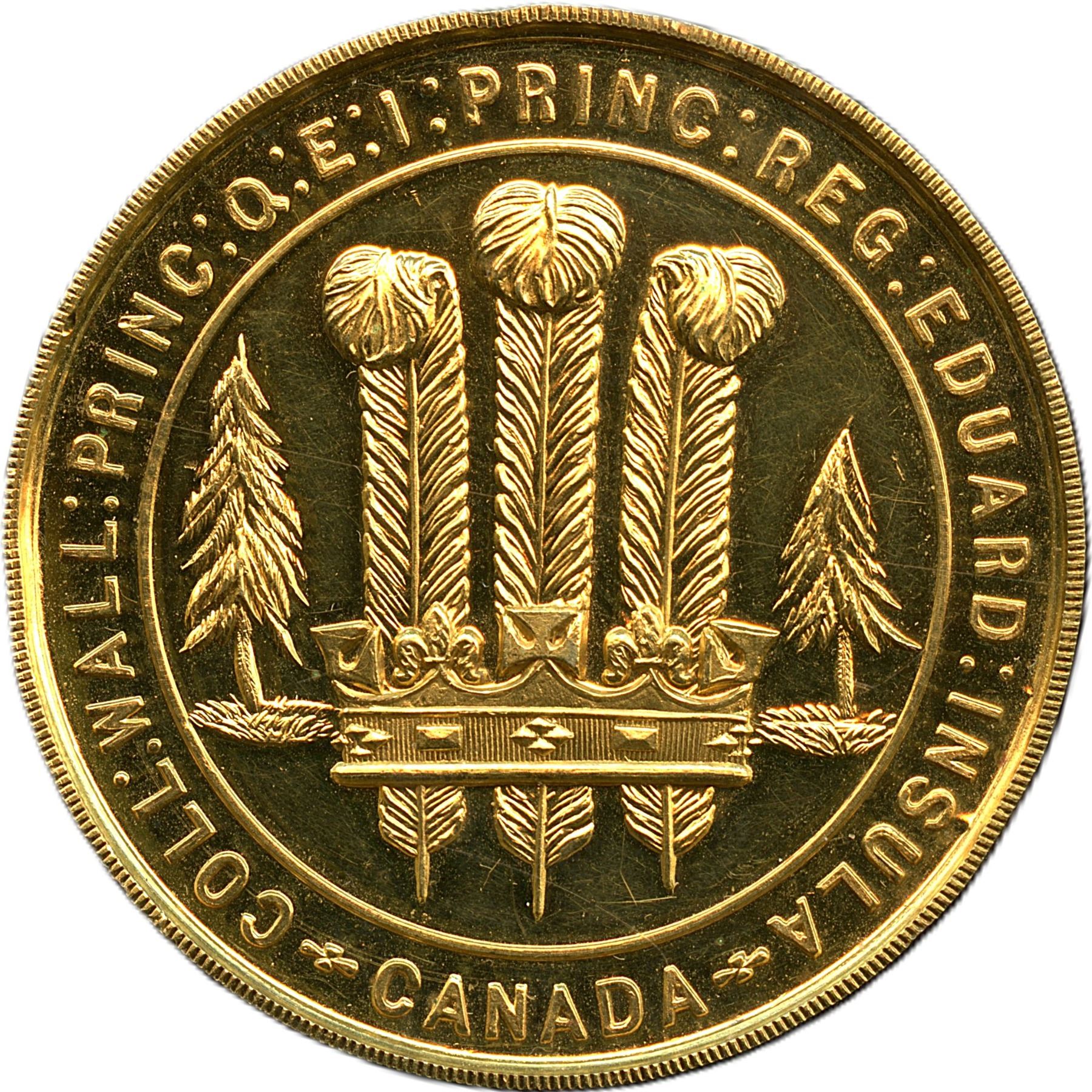The obverse has a crown superimposed with 3 plumes with a pine tree on either side. The legend reads COLL:WALL:Q:E:I:PRINC:REG:EDUARD:INSULA:CANADA. The reverse features a continuous wreath of maple leaves with a plain center suitable for engraving. Around the outside is the legend IN ALEXANDRI ANDERSON HONOREM MDCCCXCVI. The medal weighs 46.6g. Both sides are deep yellow-gold with dramatic prooflike contrast. The obverse center shows a few minor, inconsequential scratches that do not affect the rarity or overall appeal of this important piece. Note that XRF testing showed a purity of 18.63KT.