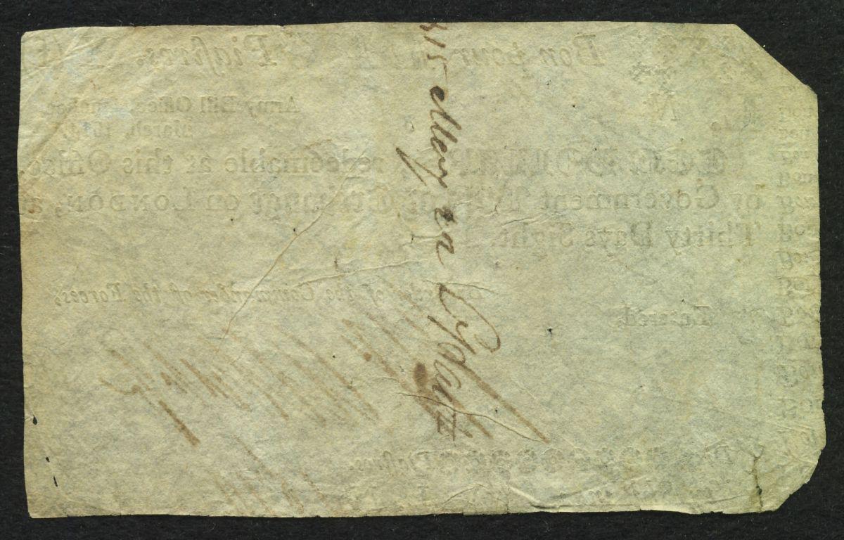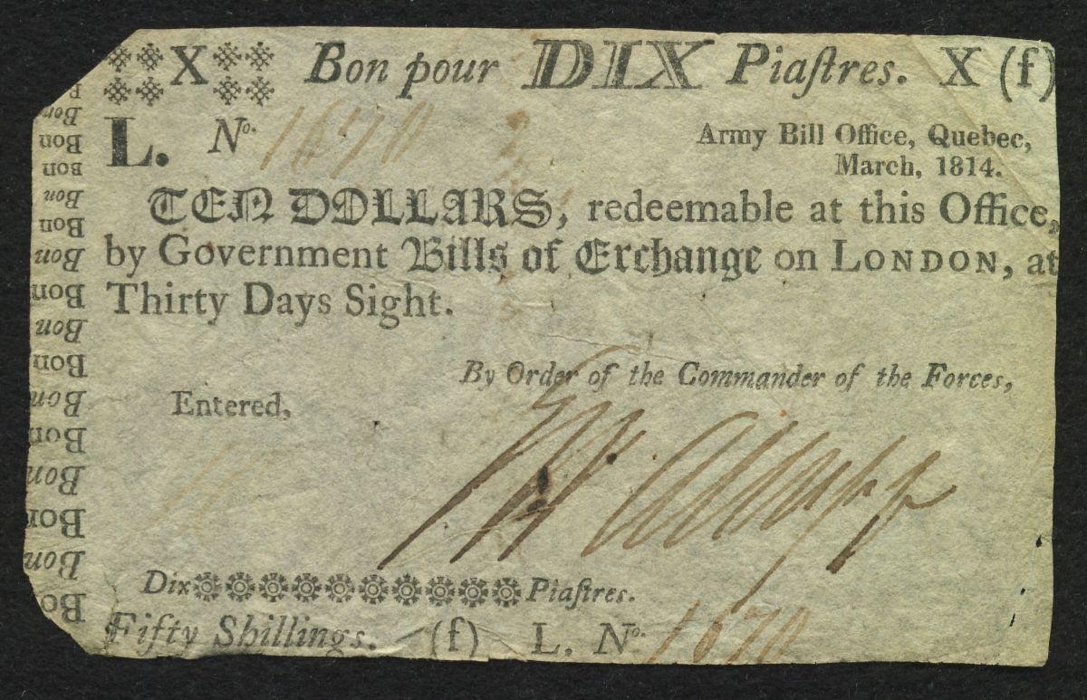 There were several issues of Army Bills, most issued from Quebec. They were used from 1813 to 1815 for purchasing supplies and paying troops stationed there. Earlier Bills of Exchange were being discounted at rather exhorbitant rates so authorities responded with the issuence of legal tender notes. This specimen is one of the Third Issue of 1814. It has the upper left and lower left corners missing but otherwise a clean note appealing to the eye. A historical rarity not to be missed,*