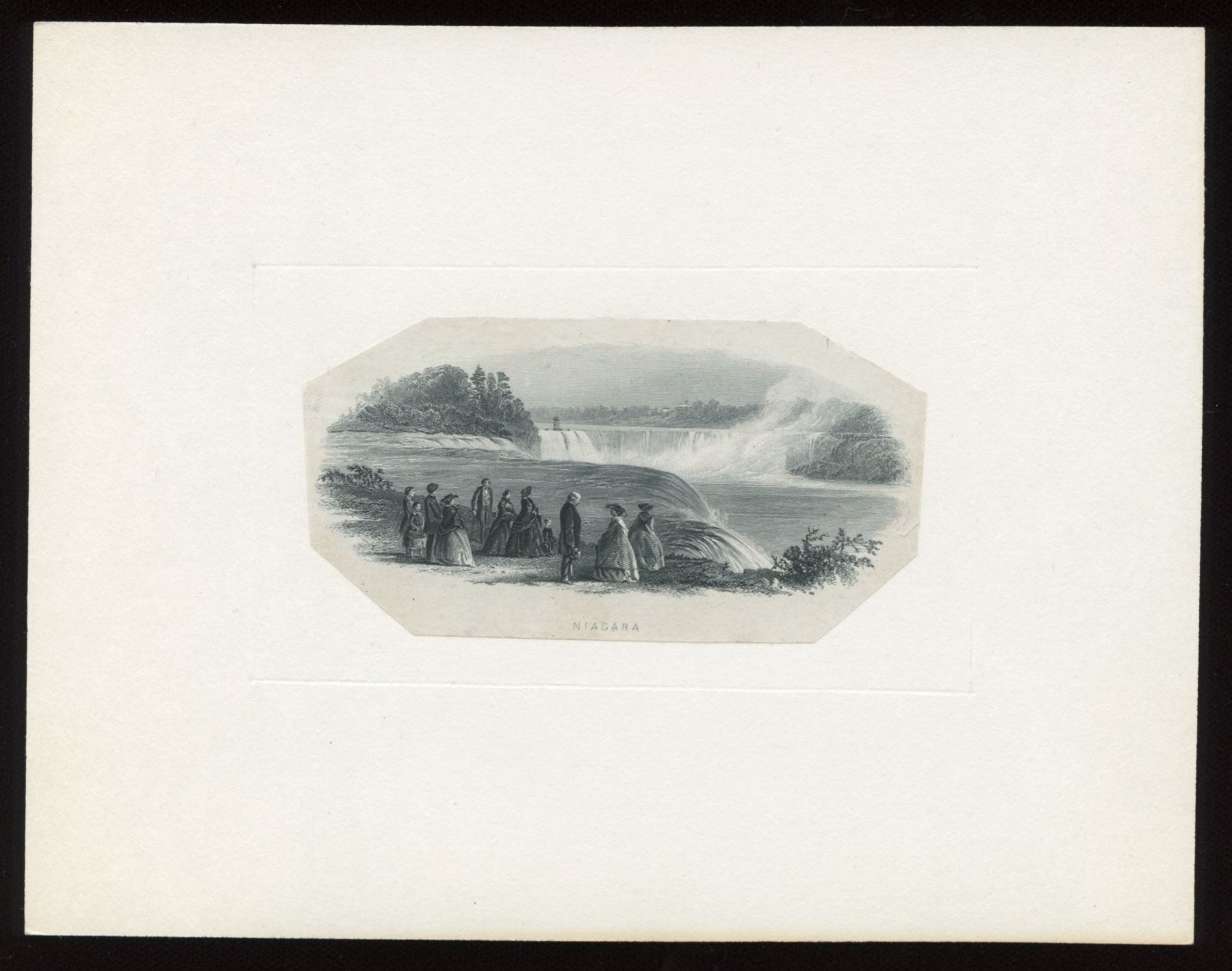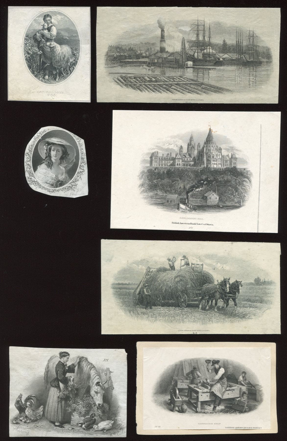 "Niagara", cut down and mounted on card; Woman with horse (on Home Bank of Canada $10s) ABN #121; "Eugenie", cut close, pencil notations; "Carpenter Shop", BABN #99; "Loading hay", BABN #513; lumber rafts, mill; "Parliament Hill", BABN #271; "Natural Love", Canada B.N. V-58.  Eight vignettes.