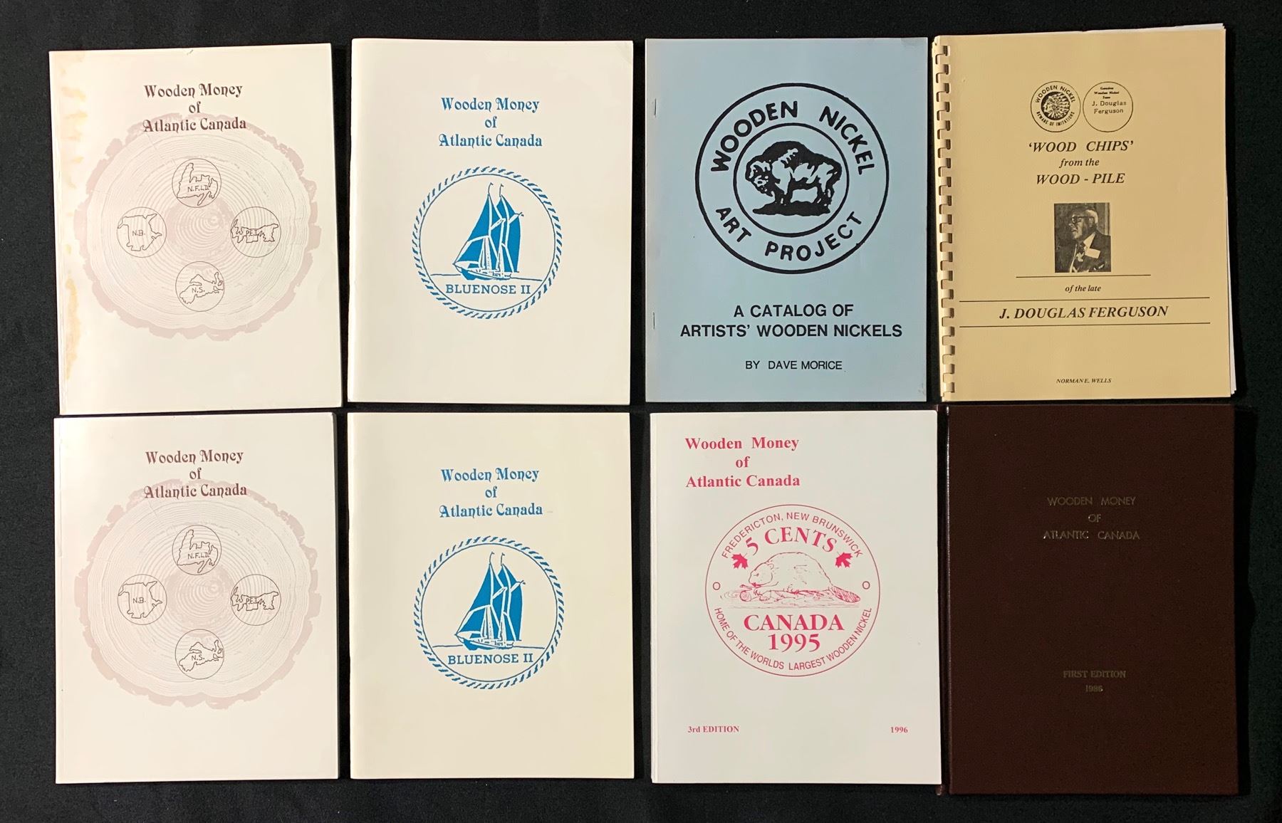 Wooden Money of Atlantic Canada, Rodger and Taylor, ( 2 copies), 1986 edition; same title, 2nd edition, 1989 ( 2 copies); another 1986 edition, hard cover signed by the authors; same title, 3rd edition, 1996, signed by Rodger and Taylor; Wood Chips, woods of J.D. Ferguson by Wells, signed presentation copy to Glenn Rodger; Wooden Nickel Art Project, Morice.