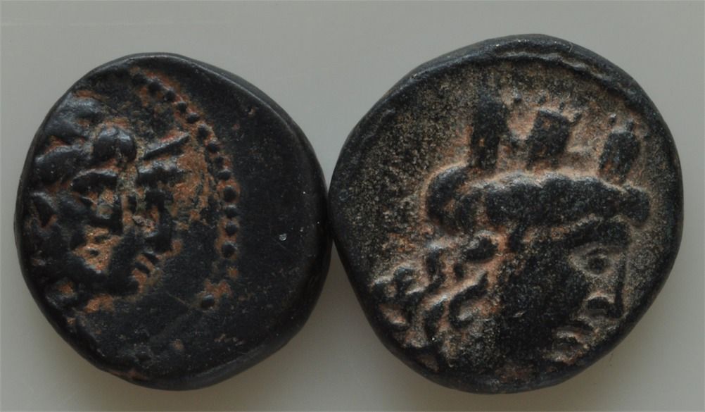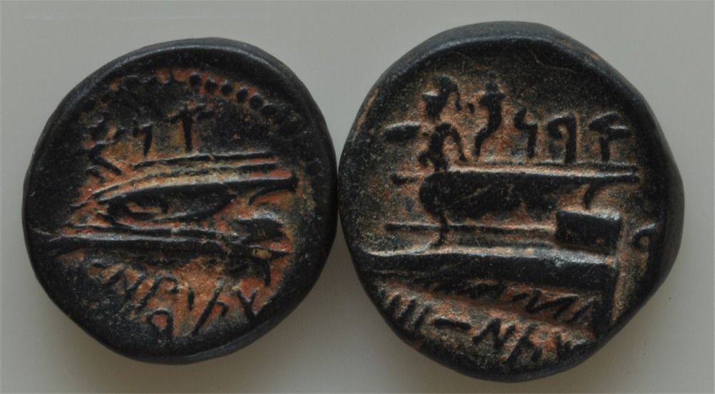 Augustus (27 BC - 14 AD) - AE-17 Aradus, Syria Obv: Dr. head of Tyche Rev: Prow of a boat l., with Athena forward. 6.1 grams BMC-346 RPC 4470; AE-16 Obv: conjoined heads of Zeus and Hera. Rev: Prow of a boat l., with Athena forward 4.2 grams. S-6004 BMC 346. 2 Pcs.