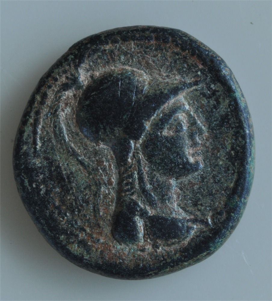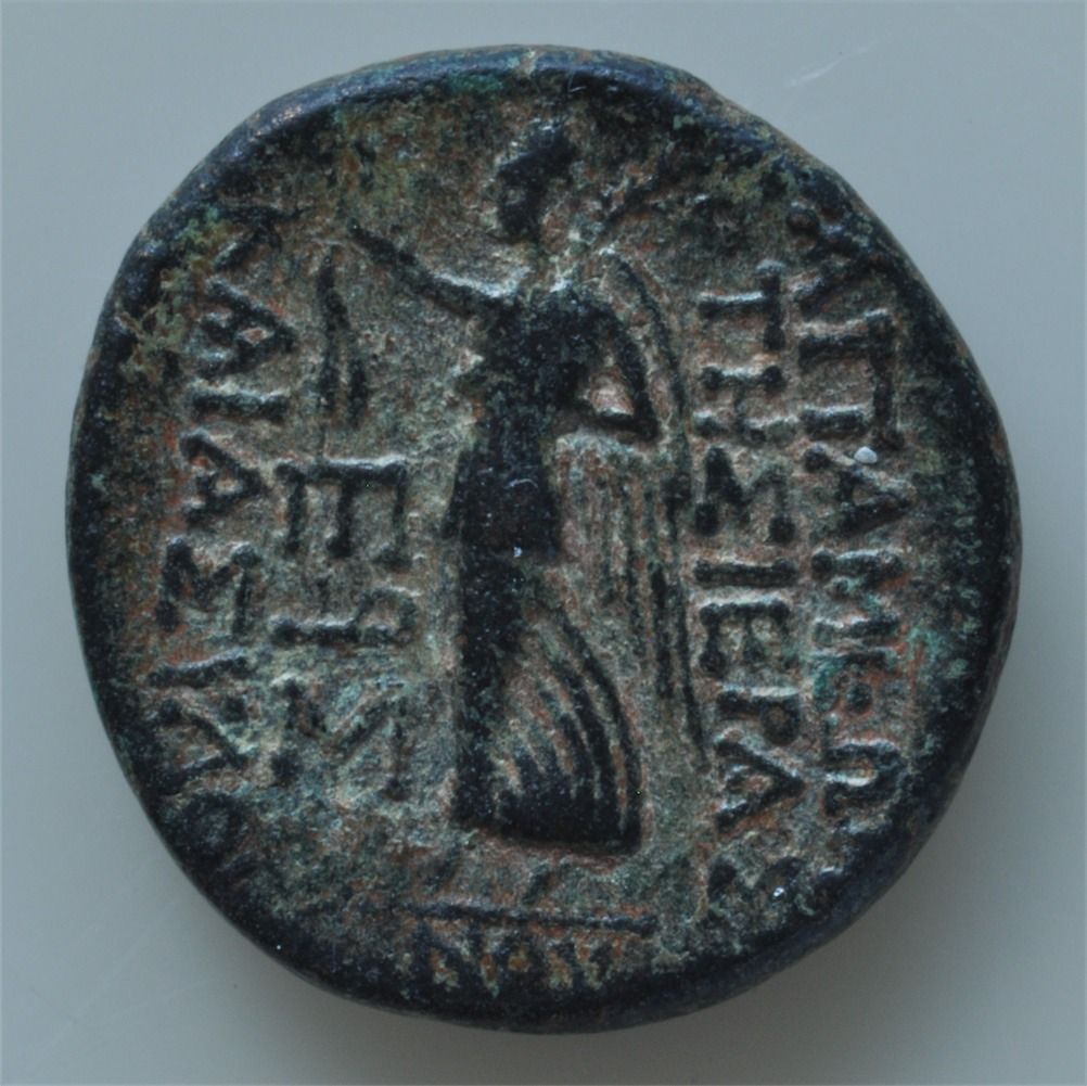 Augustus (27 BC - 14 AD) - AE-20 Apamea, Syria. 18-17 BC. Obv: Bust of Athena r., wearing a crested Corinthian helmet Rev: Nike advancing l., holding wreath and palm. In field left year EPS, in ex. NOY. 7.8 grams S-5868 RPC 4346. Very Fine.