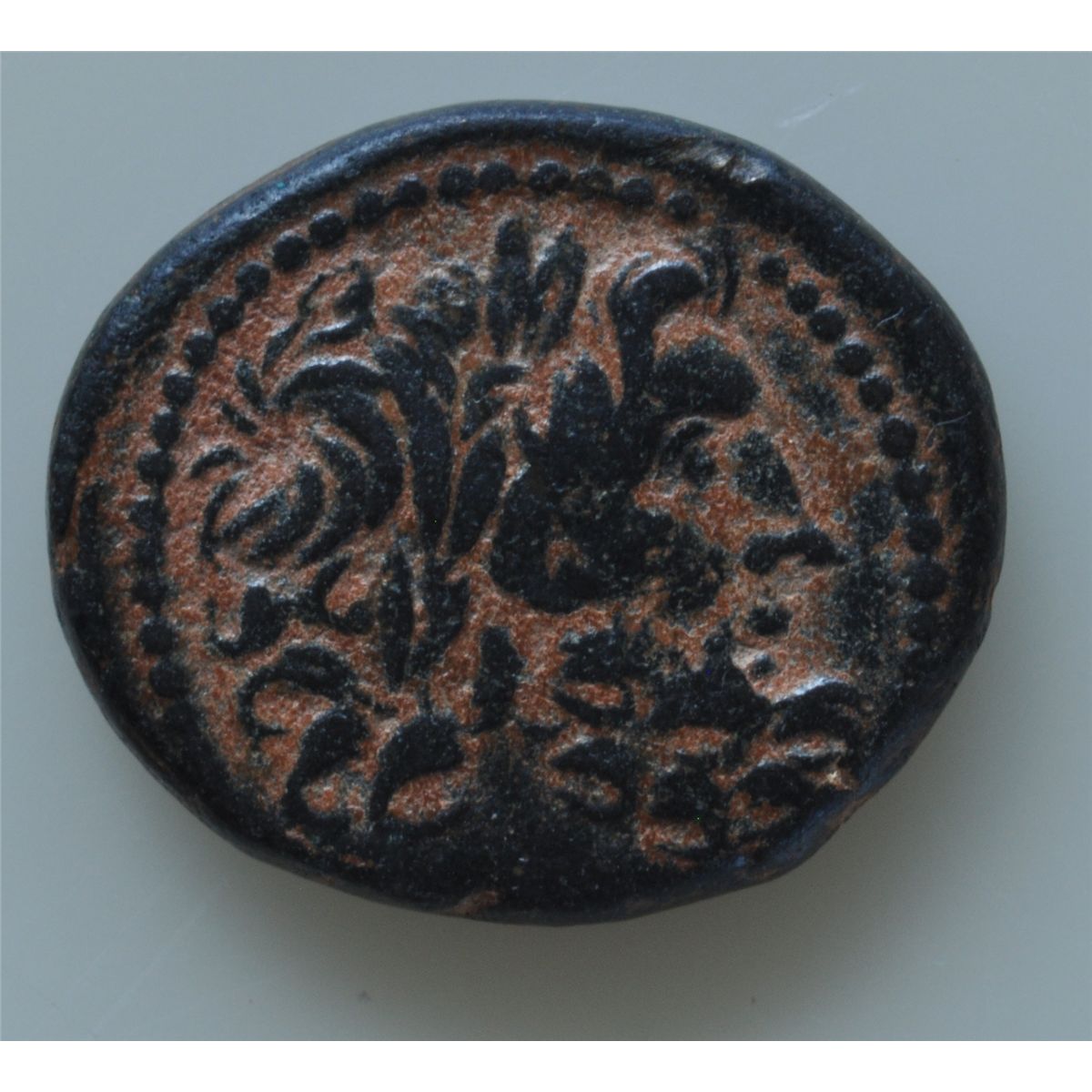 Augustus (27 BC - 14 AD) - AE-22 Antioch Obv: Laur. head of Zeus r., Rev: City god Tyche seated r., holding palm while river god Orontes swims at her feet. Year EK. Extra Fine.