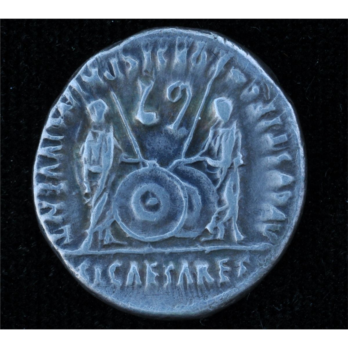 Augustus (27 BC - 14 AD) - AR-Denarius Lugdunum, 2 BC-4 AD. Obv: Laur. head of Augustus r., CAESAR AVGVSTVS DIVI F PATER PATRIAE. Rev: Gaius and Lucius Caesars stg. facing shields and spears between them AVGVSTVS F COS DESIG PRINC IVVENT. , in ex. C L CAESARES 3.8 grams S-1597 RIC 201. Nicely centered Very Fine.