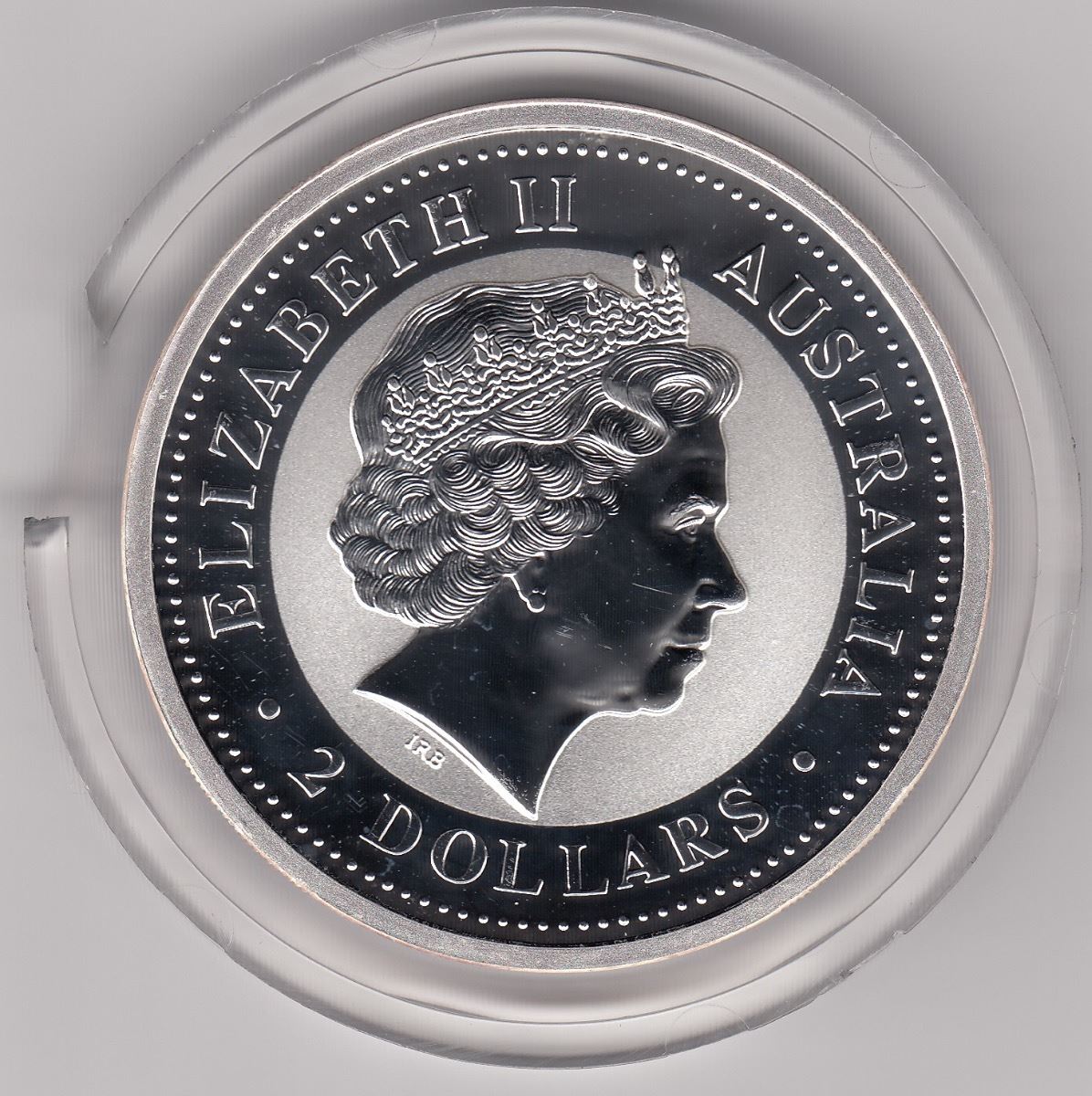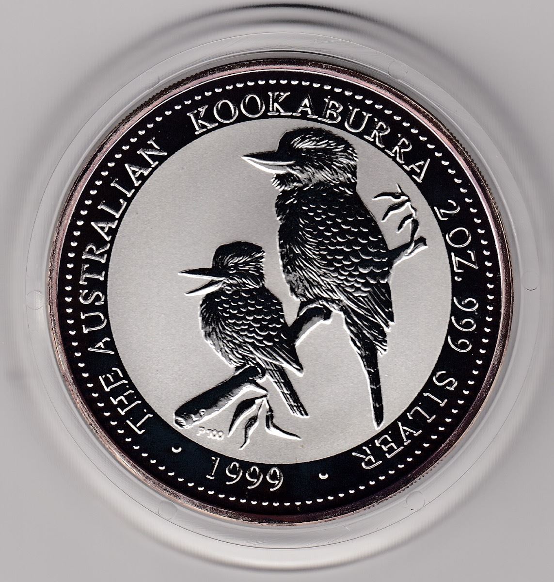 Australia Kookaburra, 1999 - 2 Oz. Silver. Presented in capsule, little damaged on edge, otherwise the coin itself is fine.