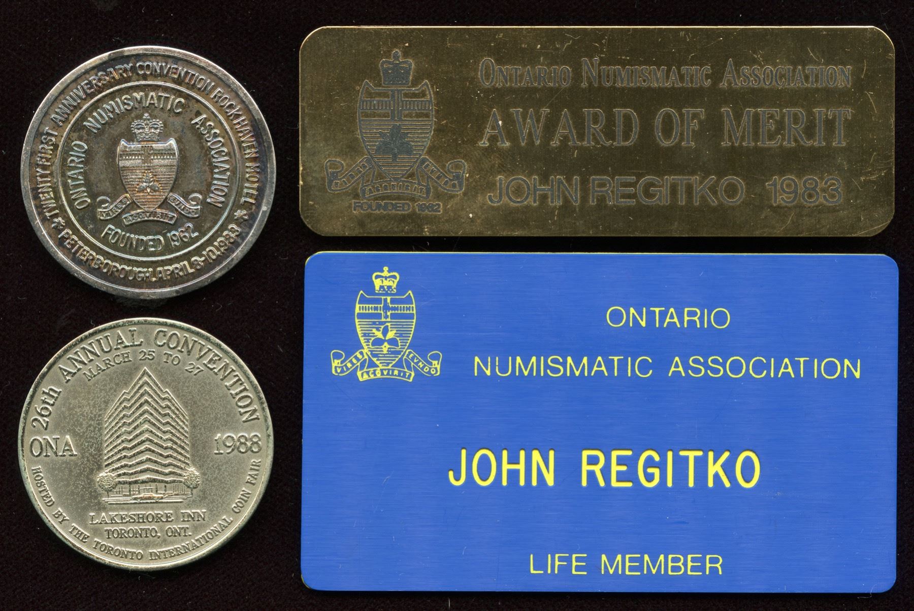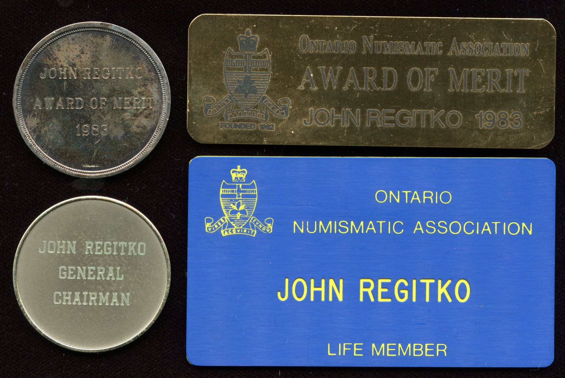 Ontario Numismatic Association Award of Merit, silver with brass name plate in brass, John's plastic Life Member name plate and a 1988 General Chairman's nickel medal inscribed to "John Regitko/General/Chairman". 4 Pcs.