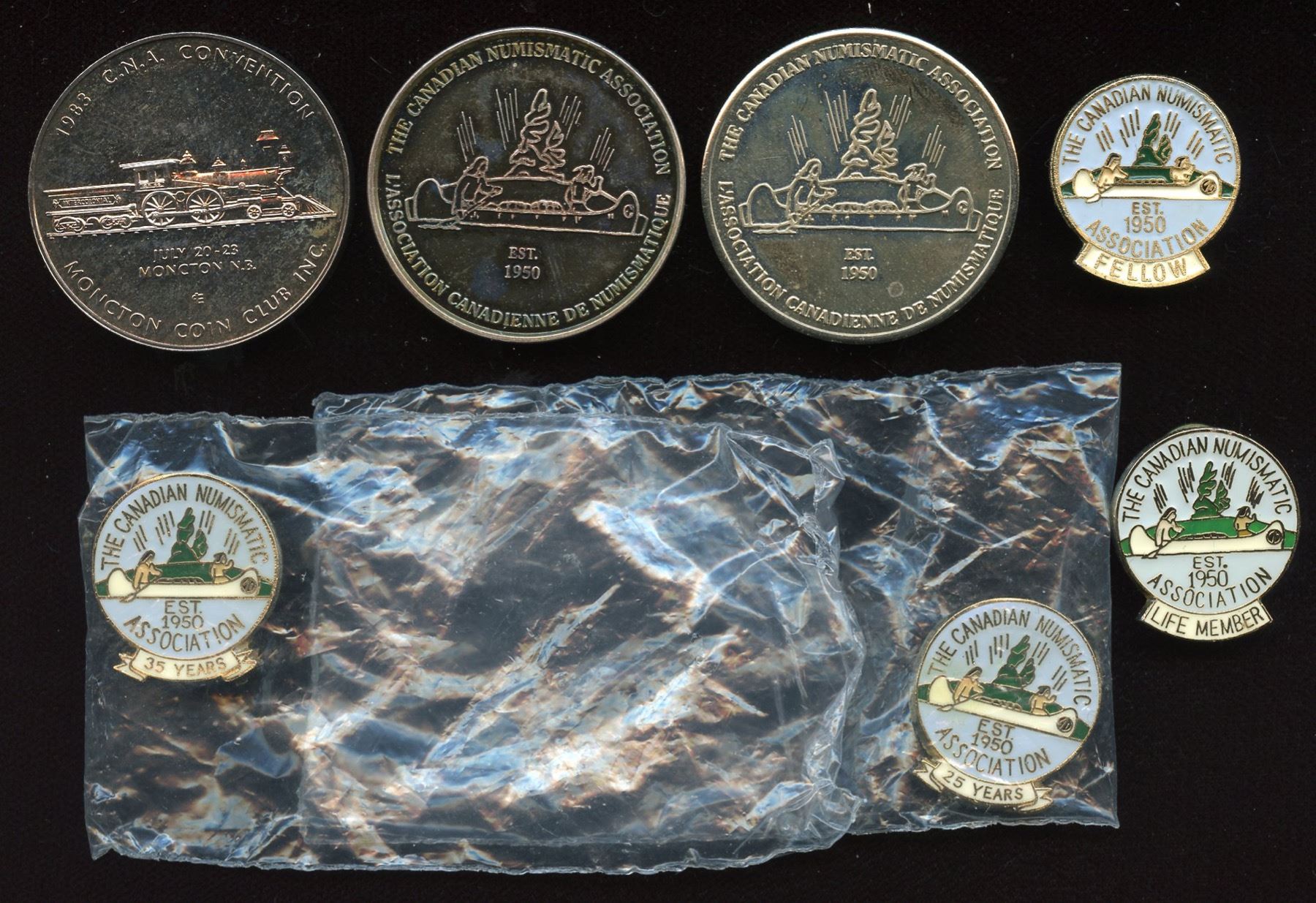 1991 Fellow of the Canadian Numismatic Association nickel inscribed "John Regitko/Fellow/Of The CNA/1991", Past President's silver medal inscribed "President/1981-1983/John Regitko", silver specimen inscribed "CNA Coin Kids/Correspondence/Course 101/John Regitko/2005", 4 CNA pins for "Fellow", "Life Member", "25 Year" and "35 year". 7 Pcs.