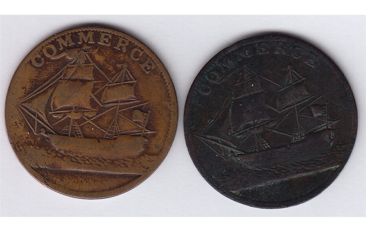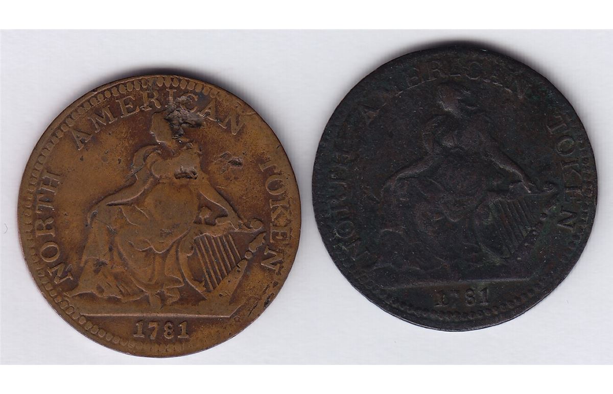 BR 1013, North American Token Lot Includes: CH AM-5A1, copper, Fine+, pitted; another, CH AM-5A2, brass, good VF+, dig on reverse. 2 Pcs.