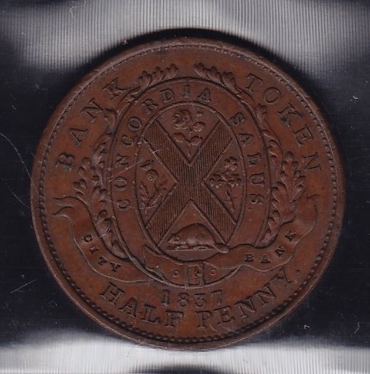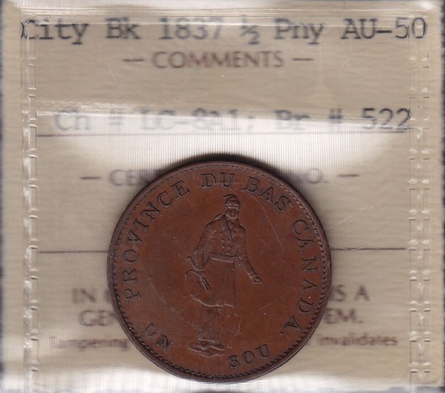 BR 522 - CH LC-8A1, 1837 Half Penny Token, ICCS AU-50.