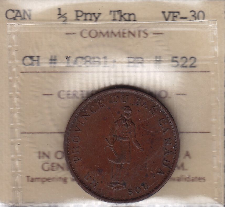 BR 522 - CH LC-8B1, 1837 Half Penny Token, ICCS VF-30.