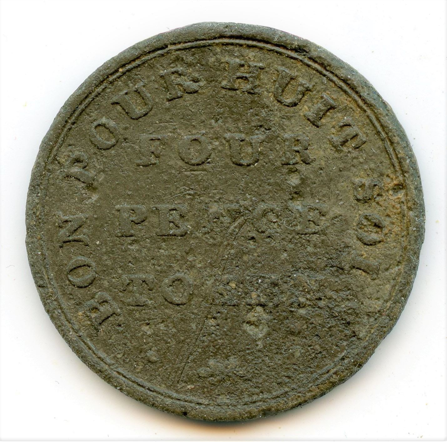 BR 560, CH-TR-2A. Lauzon Ferry Token, 1821, 6.34gms or 97.9 grains. XRF Sn 96.94%, Pb 1.73%, Cu 1.33%. Good, environmental damage.