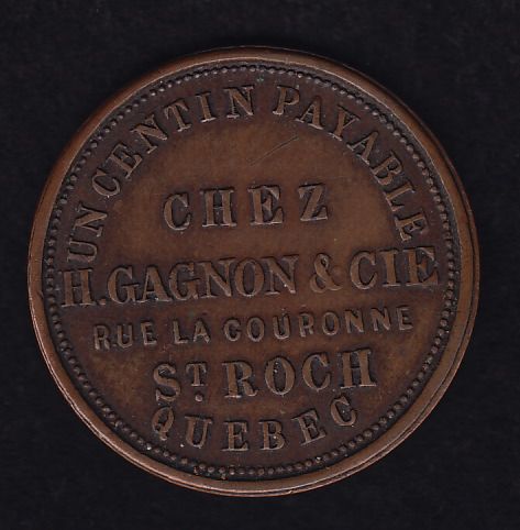 BR 571A - Gagnon & Cie, St Roch, PQ, Cu, 5.32g, VF (struck from a cancelled obverse die, unique).