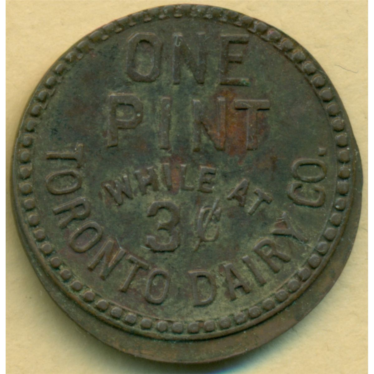 BR 812 - Toronto Dairy Co. One Pint While at 3c, Brass 2.8gms, 22mm Uniface SCARCE (ex: Mel Reiter).