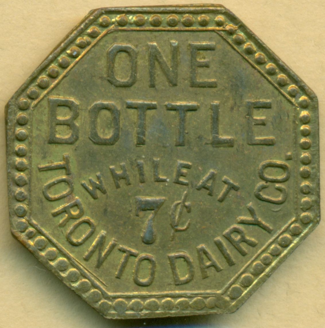 BR 813 - Toronto Dairy Co. One Bottle While at 7c, Brass 3.0gms, 22mm Uniface SCARCE (ex: Mel Reiter).