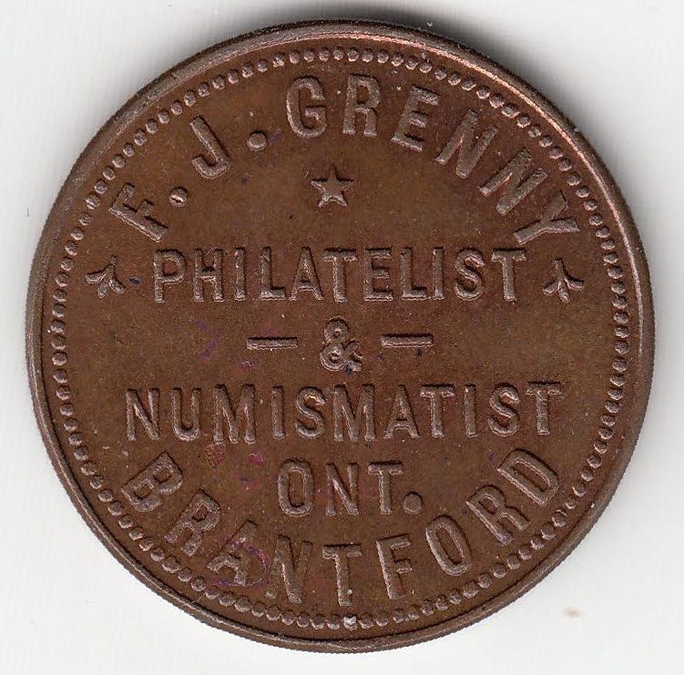 BR 836. F.J. Grenny/ Philatelist/ &/ Numismatist/ Ont./ Brantford. Rev: Good for/ 50/ Cents/ in Trade. Copper, 29.5mm, EF.