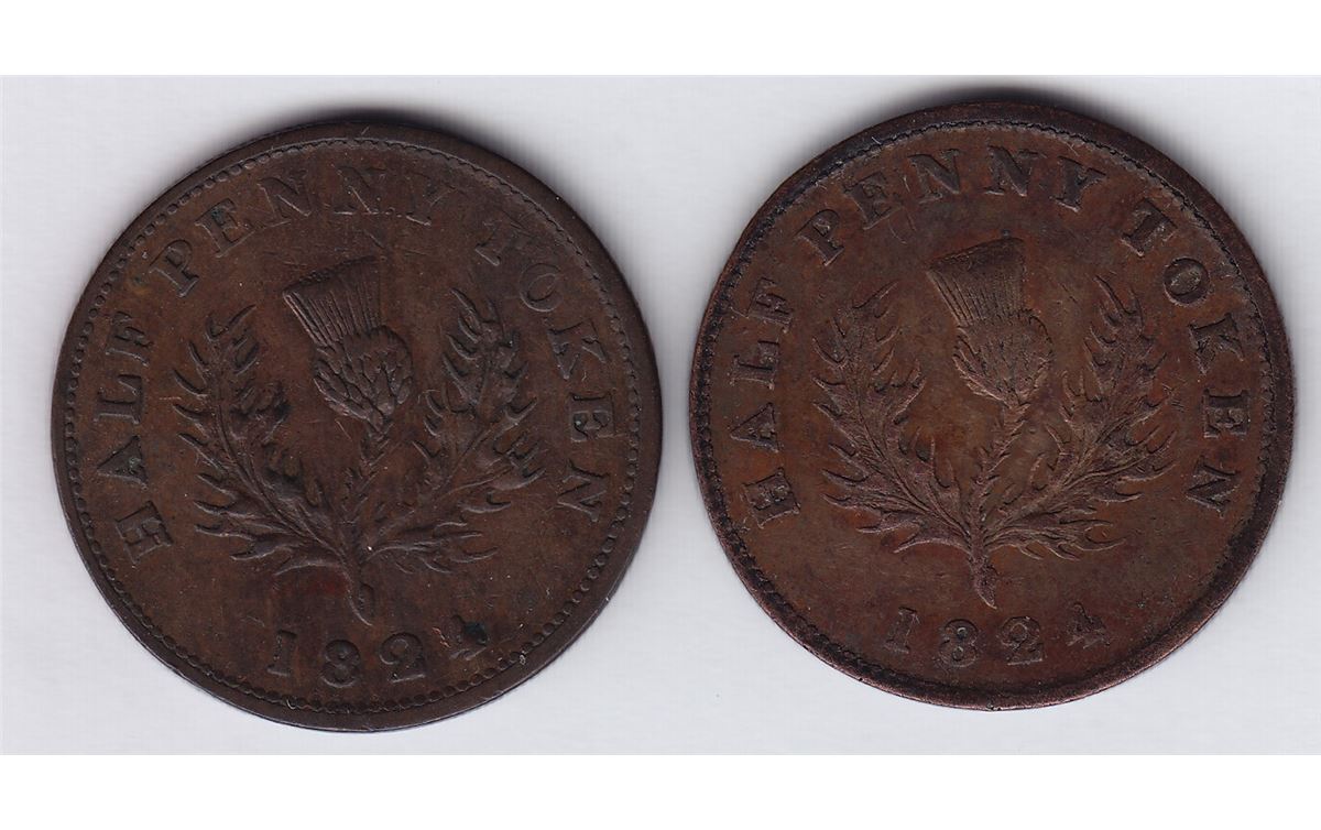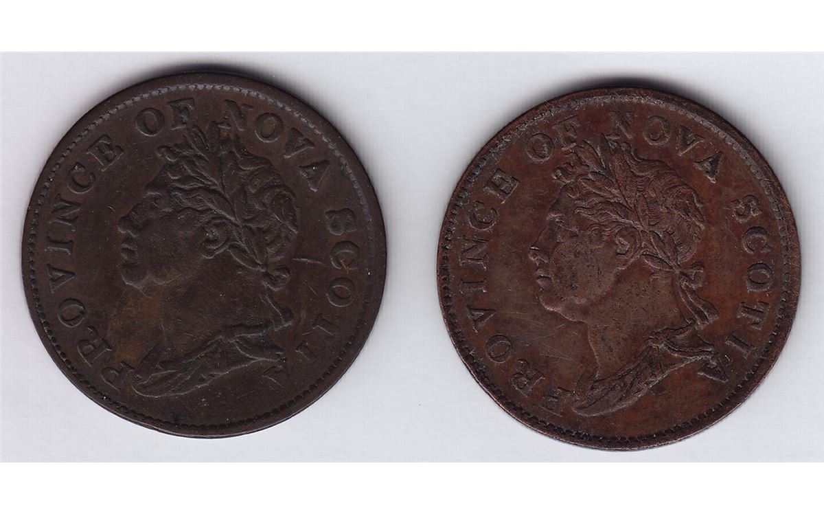 BR 869 (1824), N.S. Halfpennies Includes: Courteau 259, CH NS-1C2, good VF, and a second example abt EF but clearly a later strike from a rusted obverse die. 2 Pcs.