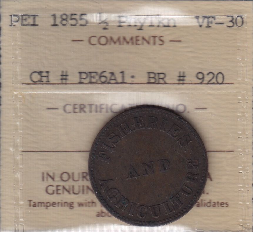 BR 920 - CH PE-6A1, 1855 Half Penny Token, ICCS VF-30.