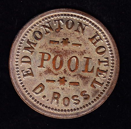 BR 933 Edmonton Hotel - D. Ross purchased his cutlery and silverware from the Peck Co. in Chicago. Supposedly, Peck set him up with 1250 of the tokens but they now are extremely rare and seldon appear in the marketplace. The last example appeared in the Hughes Sale in 1995. Ex:Temple.