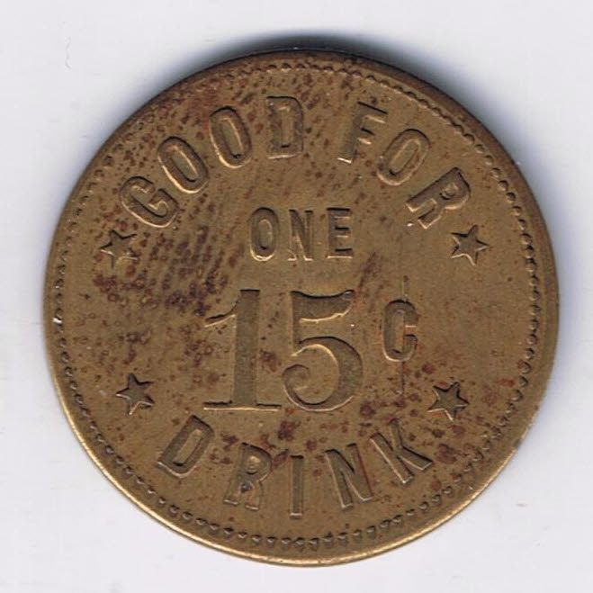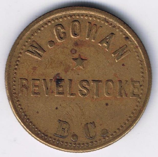 BR 938. W. Cowan Revelstoke B.C. Good for one 15c drink. Brass, 25mm, 4.69g, EF.