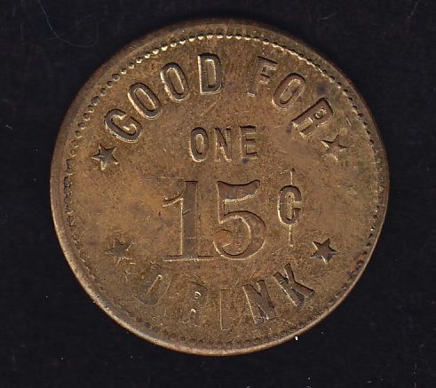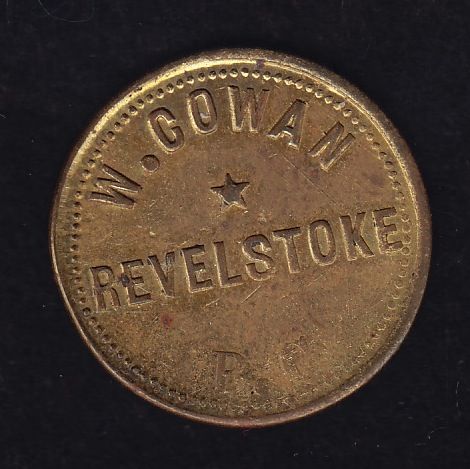 BR 938 - W. Cowan Revelstoke B.C. Good for one 15c drink. Brass, 25mm, 4.69g, EF.