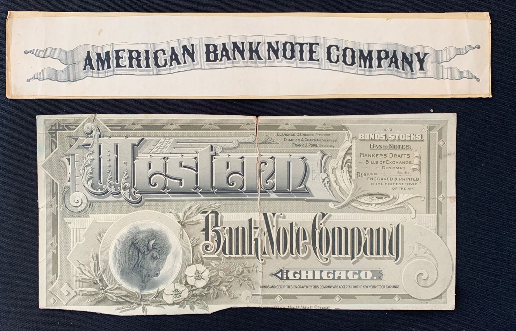Engraved American Bank Note Co. name on banner; Western Bank Note Co., Chicago, sign, mounted on card which has unfortunately broken down the centre, portion removed at bottom. Has a bison vignette. This latter item sold for US $75 plus buyer's premium in Archives International Sale on 25 June 2015, lot 460.