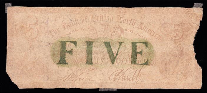 Bank of British North America $5, 1871, Quebec issue. Contemporary Counterfeit - Bank of British North America, Quebec issue, Five Dollars, 22 Novr, 1871, large green "FIVE" protector, CH 55-16-16-12C. Black SN 44490. Machine overprint, in block letters, "COUNTERFEIT" twice on back, in purple. Overall AG, faded. Bottom left corner missing, chunk missing out of right border, repaired tear bottom right. Evidence of hinge mounting on back. There are no known issued notes.