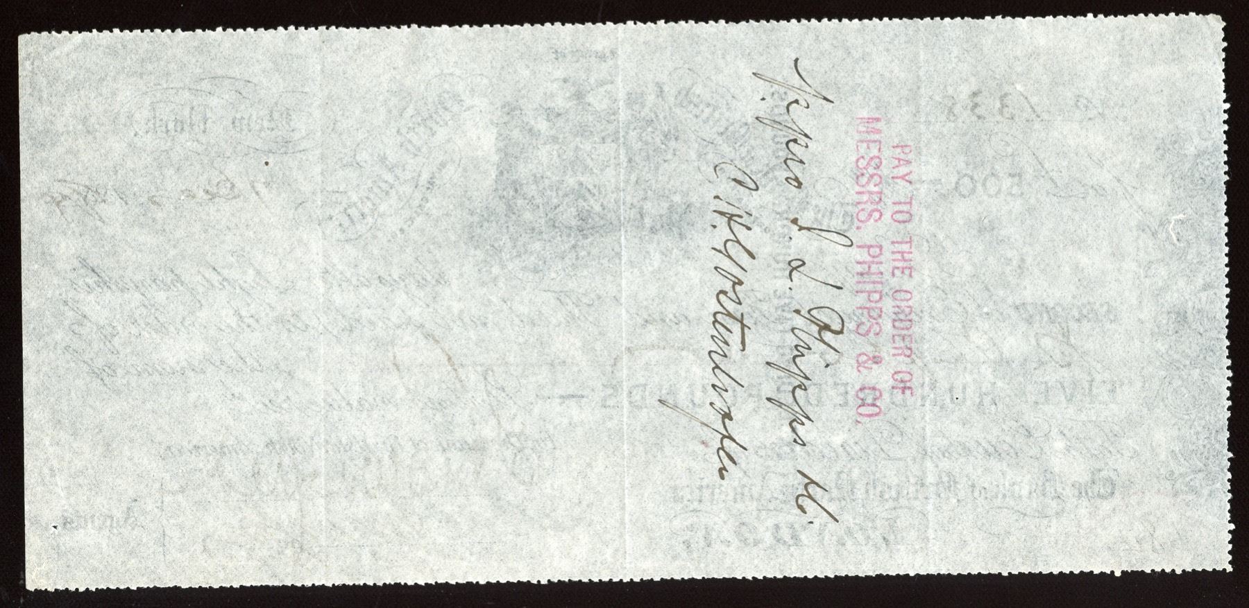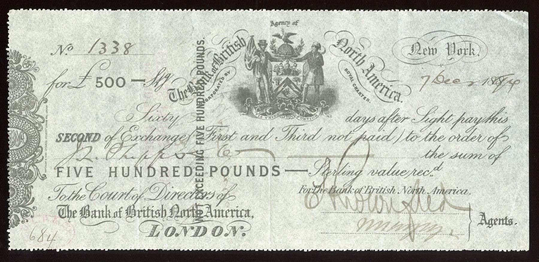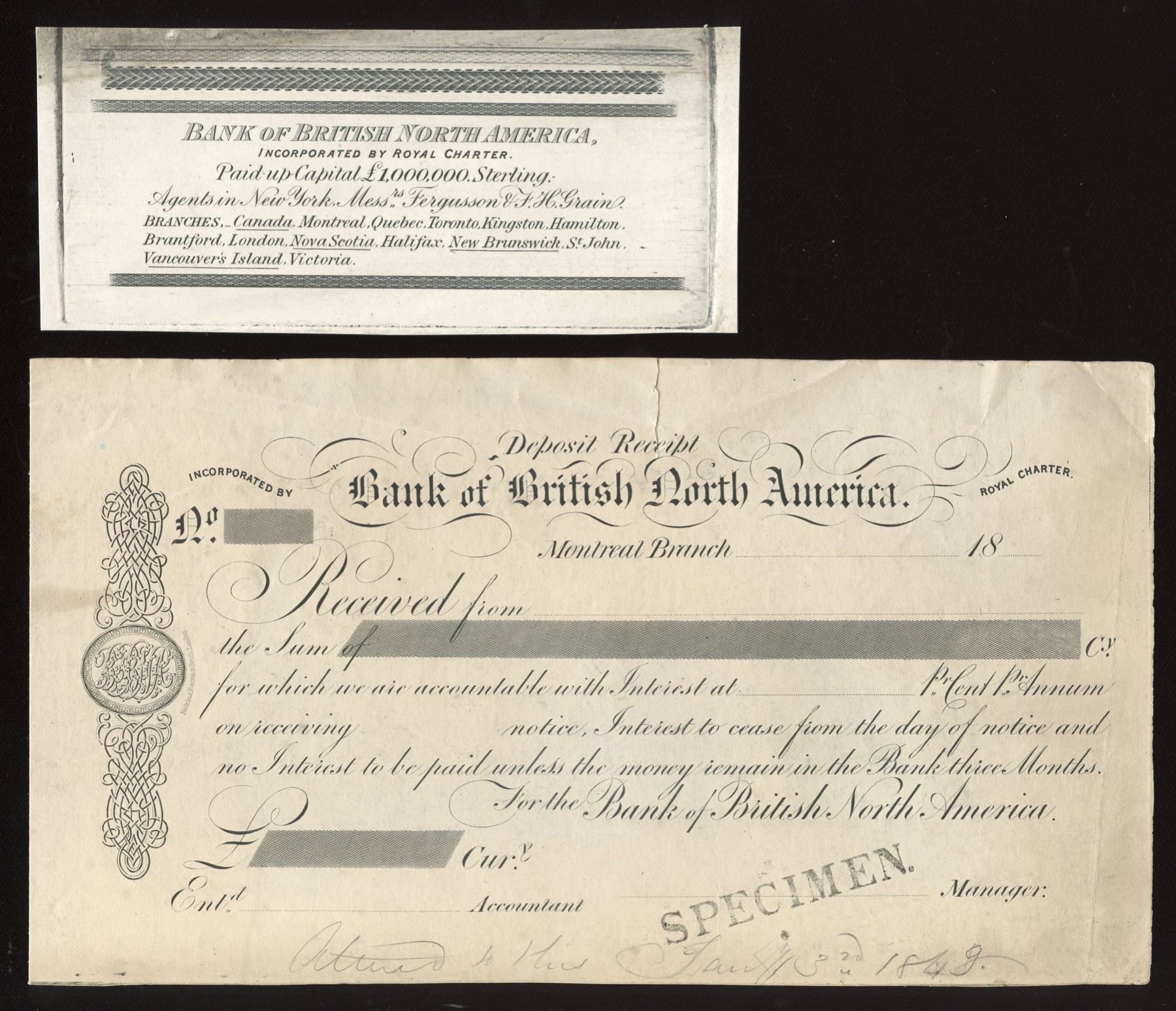 Bank of British North America, Bill of Exchange, 1894, Waterlow imprint. Lot includes an engraved information card showing branches (1850s perhaps), and a Perkins, Bacon engraved Deposit Receipt form, stamped Specimen, with pencilled instruction to alter date to Jan. 3rd 1849 and small tear at top. Three items.