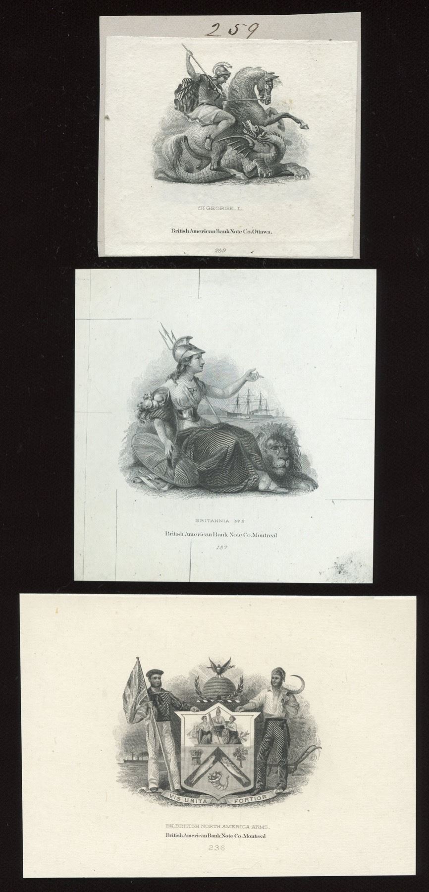 Bank of British North America, three die proof vignettes by British American Bank Note. Britannia; St. George and dragon; arms of the bank.