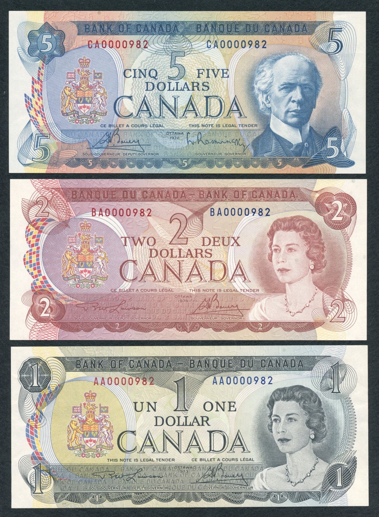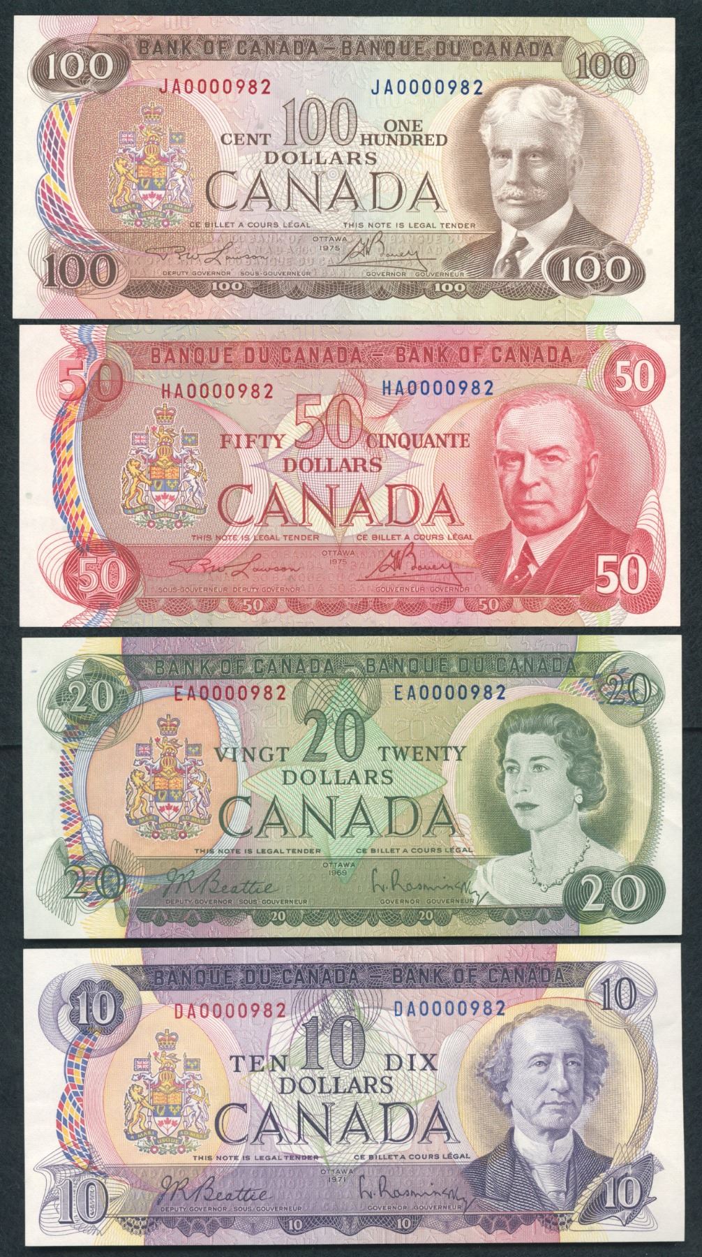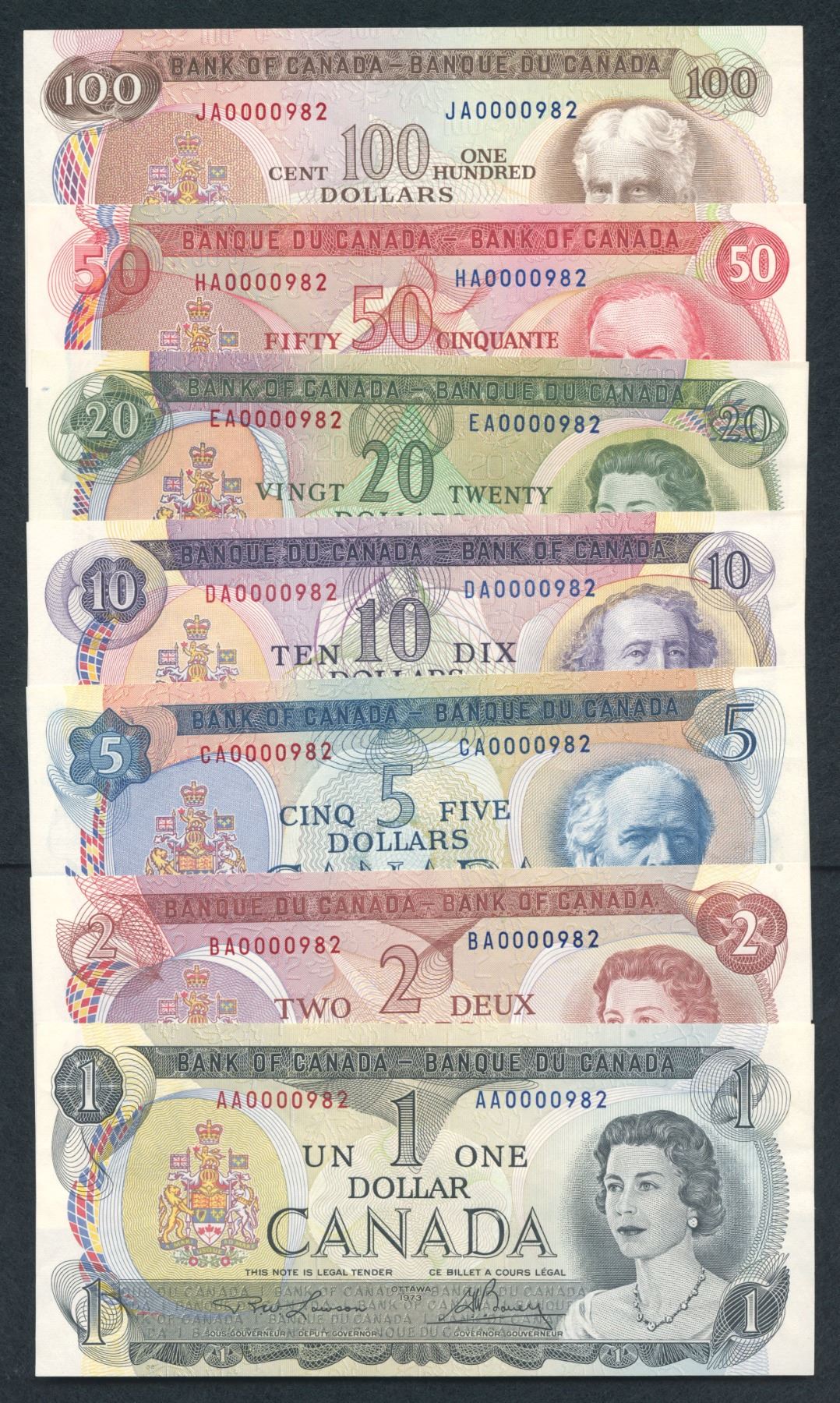 Uncirculated group with bright, fresh colours. Matching low serial numbers 982, Label indicates ex: Pittman. 7 pcs.