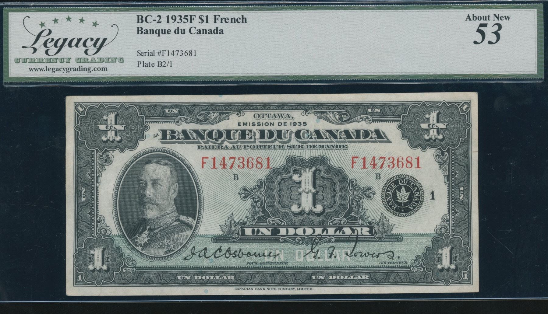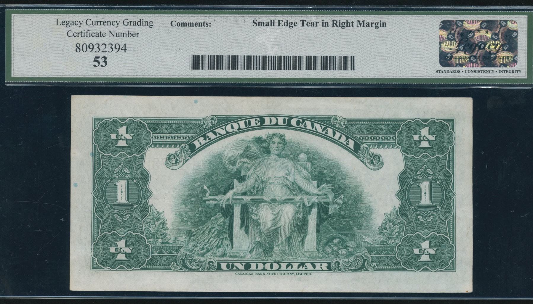 BC-2. Legacy AU53, small edge tear in right margin. S/N:F1473681/B.