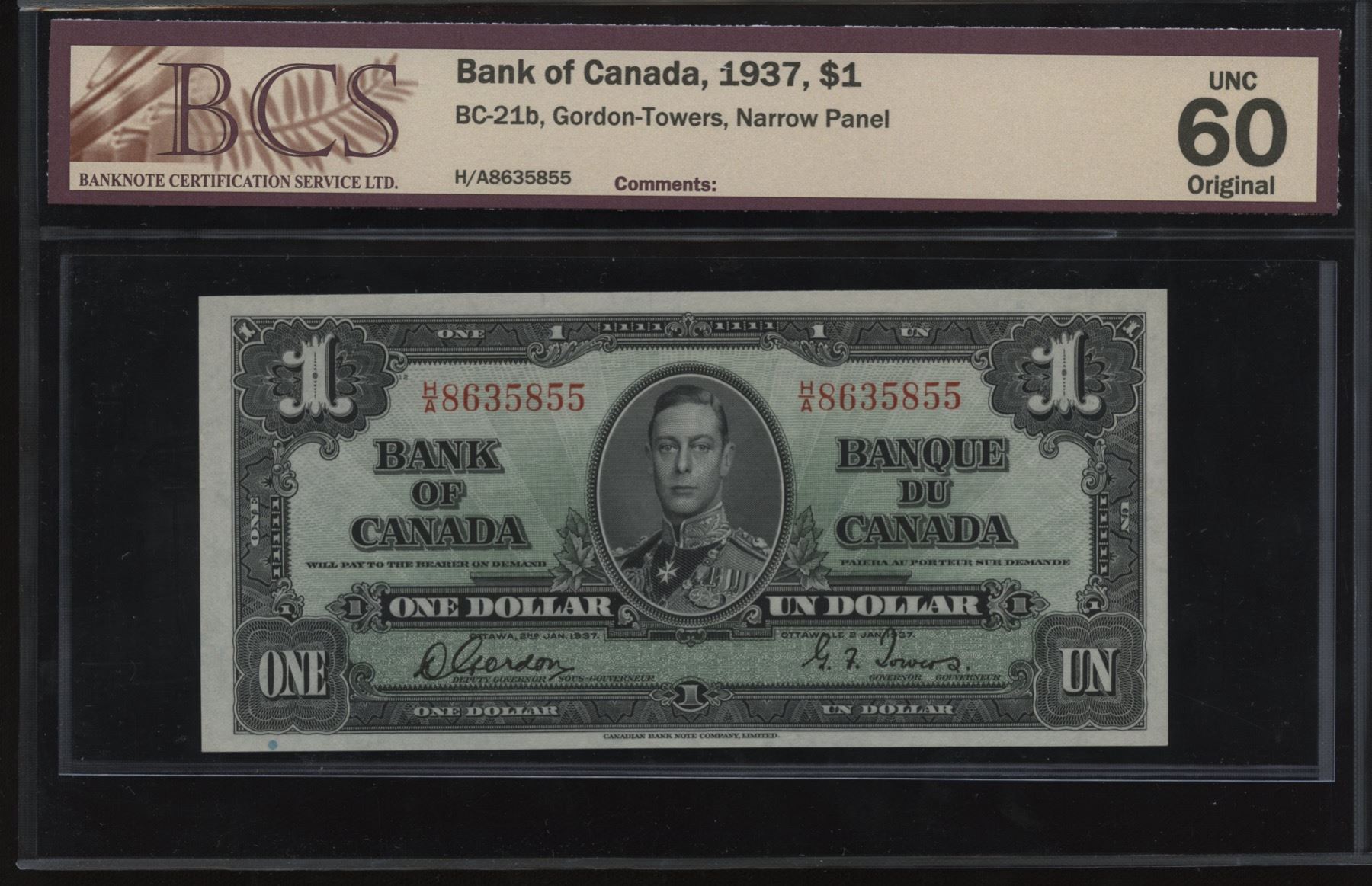 BC-21b. BCS Unc. 60, original. S/N:H/A8635855.